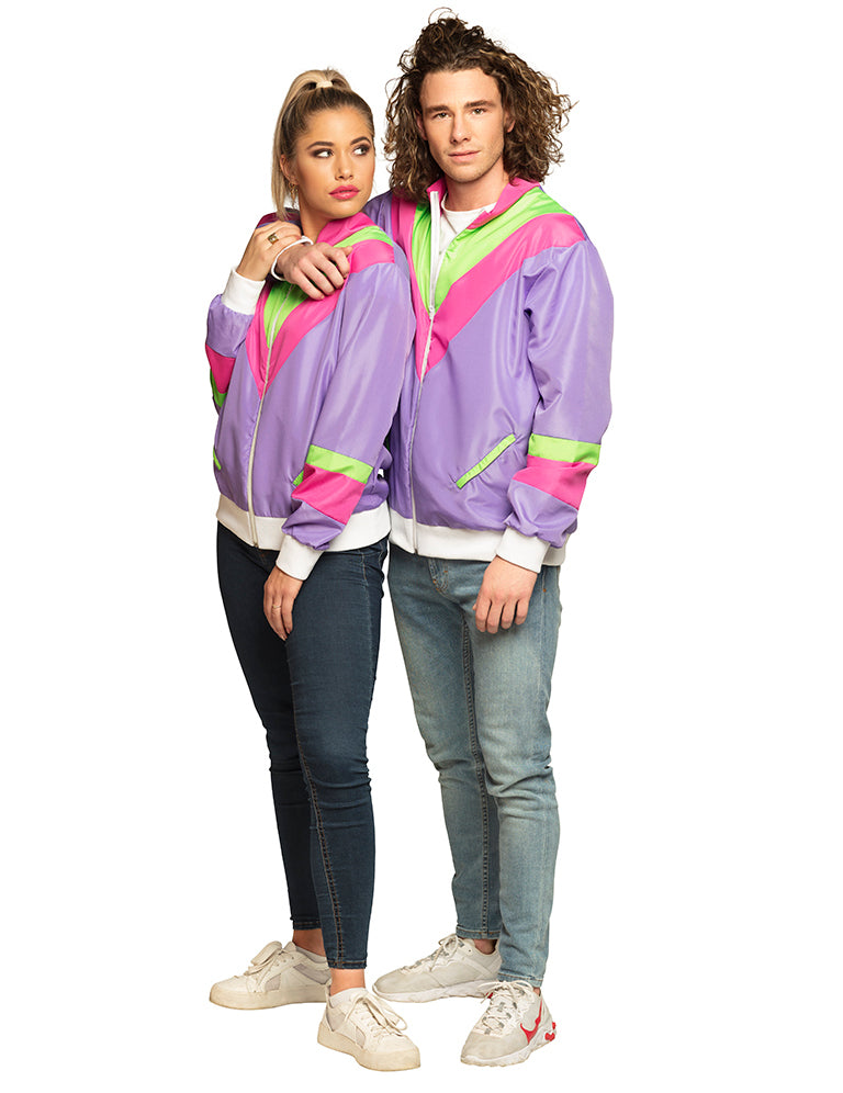 Ez a 80 -as évek kocogása a férfiak számára készült. Lila, széles zöld és rózsaszín zenekarokkal a gallérnál és az ujjakkal. Hamis zsebei vannak az oldalán. A kabát elülső cipzárral bezáródik. Kiváló lesz a 80 -as évek ruhájának kitöltésére a karnevál alkalmával vagy egy gicch estére.