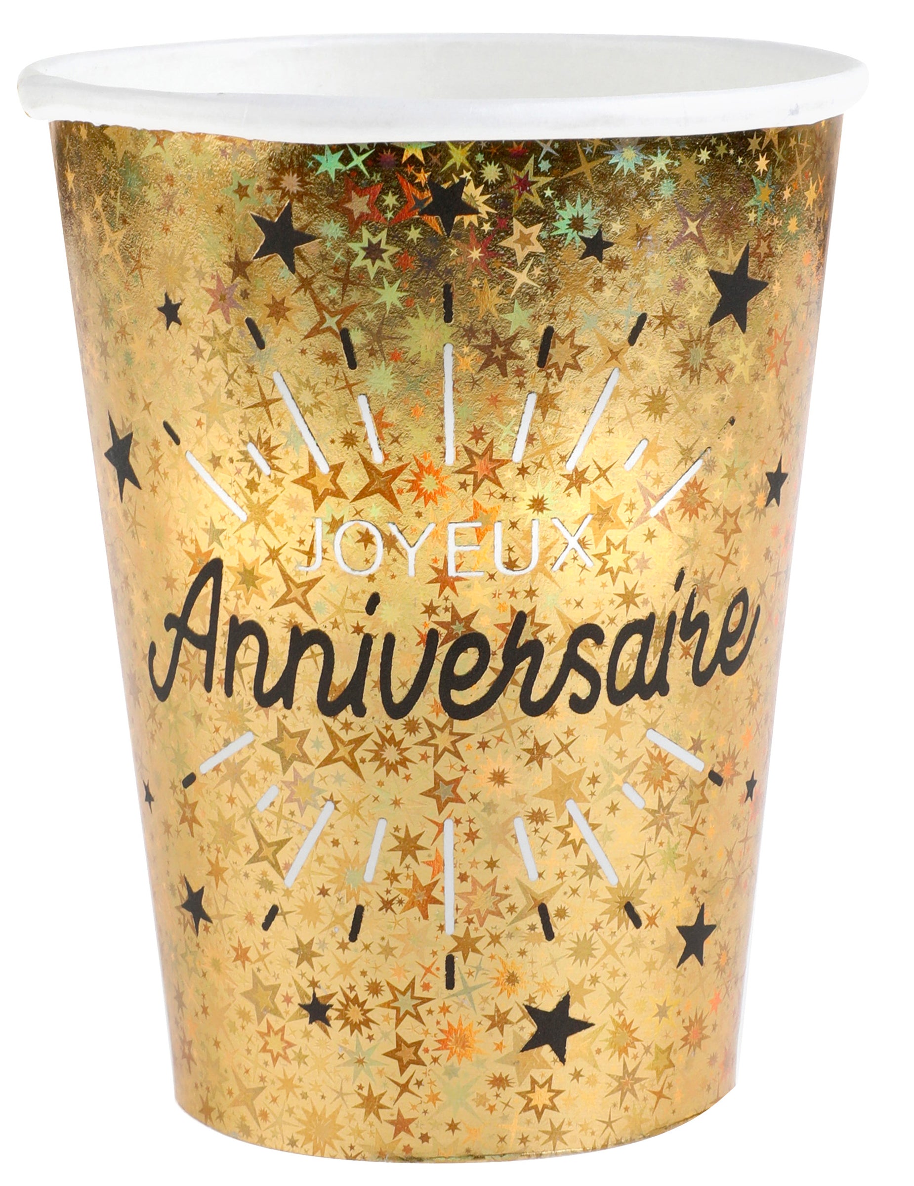 Dobj fel egy csipetnyi csillogást a bulidra ezzel a 10 darabos szettel csészék Kartonból készült. Elegáns arany színnel és az üzenettel. Boldog születésnapot Fekete színben ezek a tartályok 7,8 x 9,7 méretűek. cm. Ideális kiegészítők egy születésnapi asztal sikkes és csillogó. A sikeres vizuális hatás érdekében ne habozzon párosítani őket egy születésnapi dekorációk fekete, fehér és arany árnyalatokban, hogy tökéletesítse az ünnepi hangulatot.