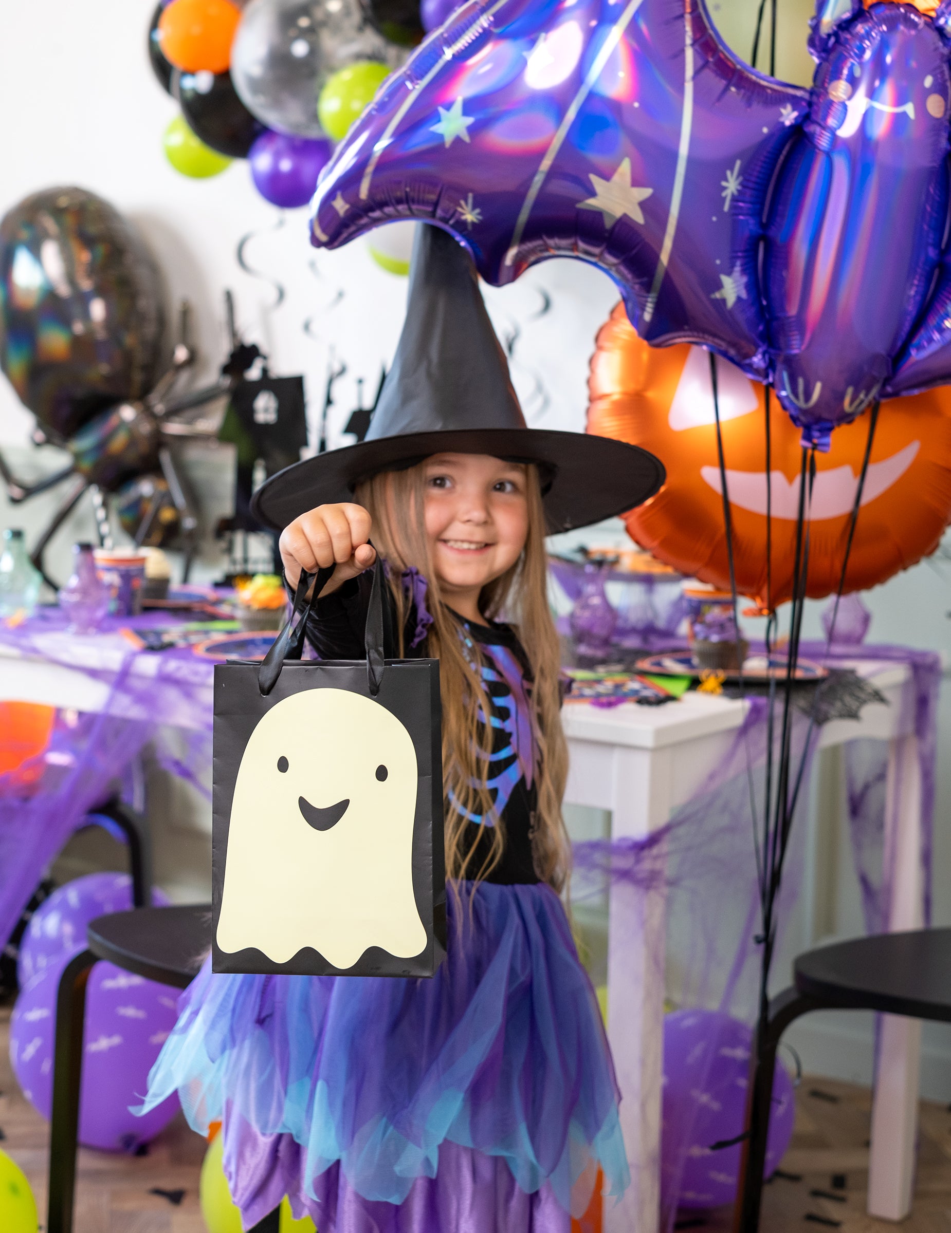 Ez a Ghost Candy táska foszforeszcensek, 22 cm. A táska teljesen fekete, fogantyúkkal és fehér szellemmel, amely éjszaka foszforeszkáló lesz! Vegye figyelembe ezeket a foszforeszkáló szellem cukorka táskákat a szomszédos turné során! Minden rossz lesz, és visszatérsz a cukorkákkal töltött táskákkal!
