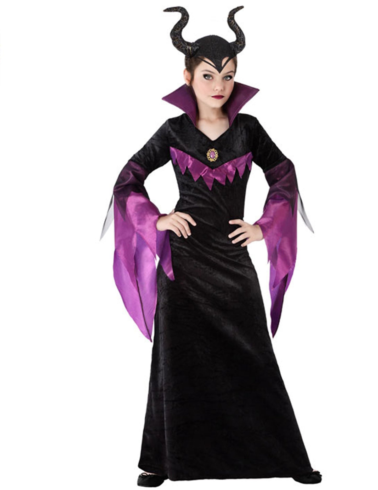 Ez a csúnya királynő jelmez a lány számára egy ruhából áll (nem tartalmazza a fejbeszélőt). A hosszú ruha fekete és lila. Nagyon hosszú hüvelyekkel, valamint magas lilagallérral rendelkezik. Ez a boszorkány ruha tökéletes lesz a Halloween szupervadászok játékához.
