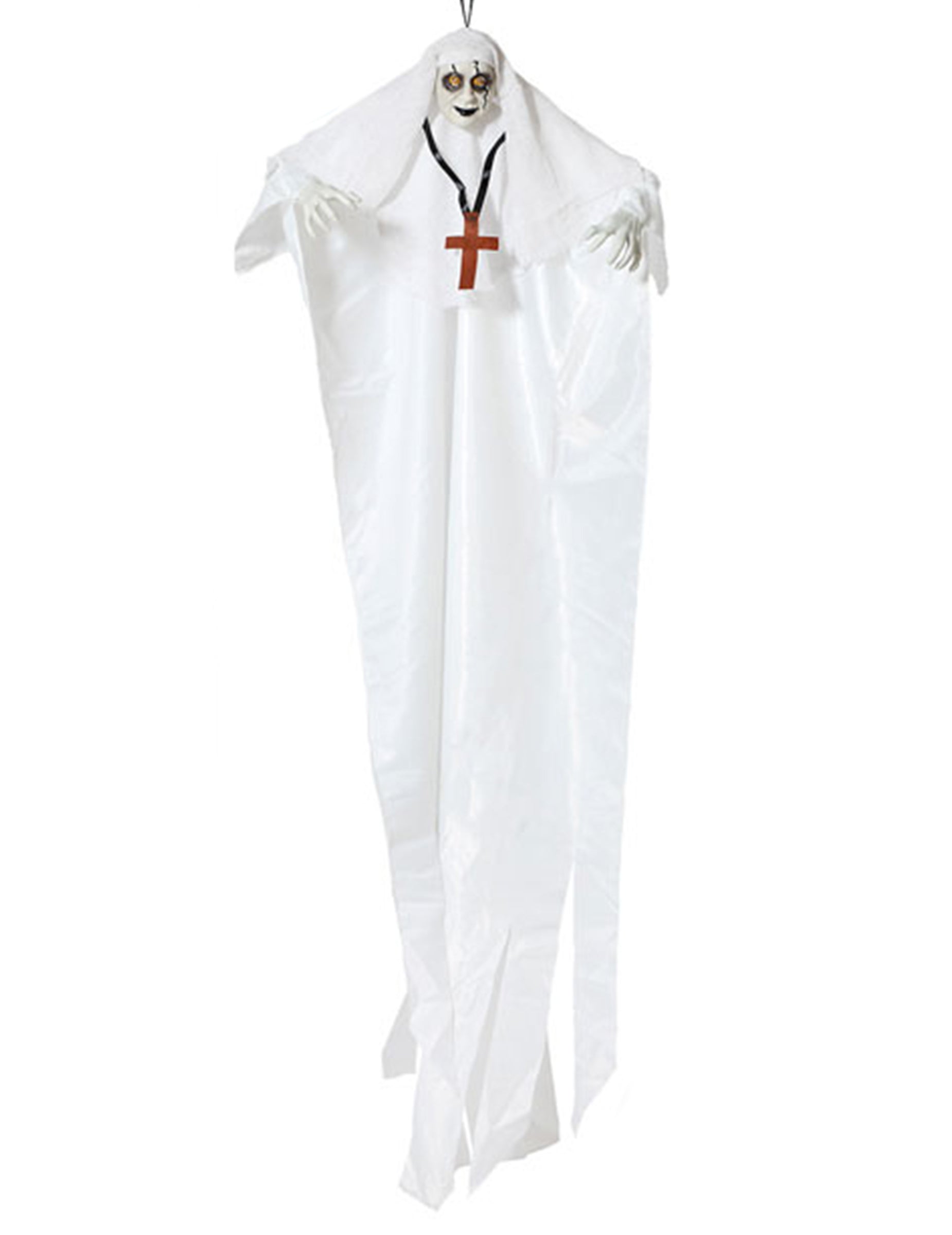 Ez függő dekoráció Egy zombi apácát ábrázol. Teljesen fehérbe van öltözve. Nagyon sápadt az arca és a keze. A szemeit fekete veszi körül.