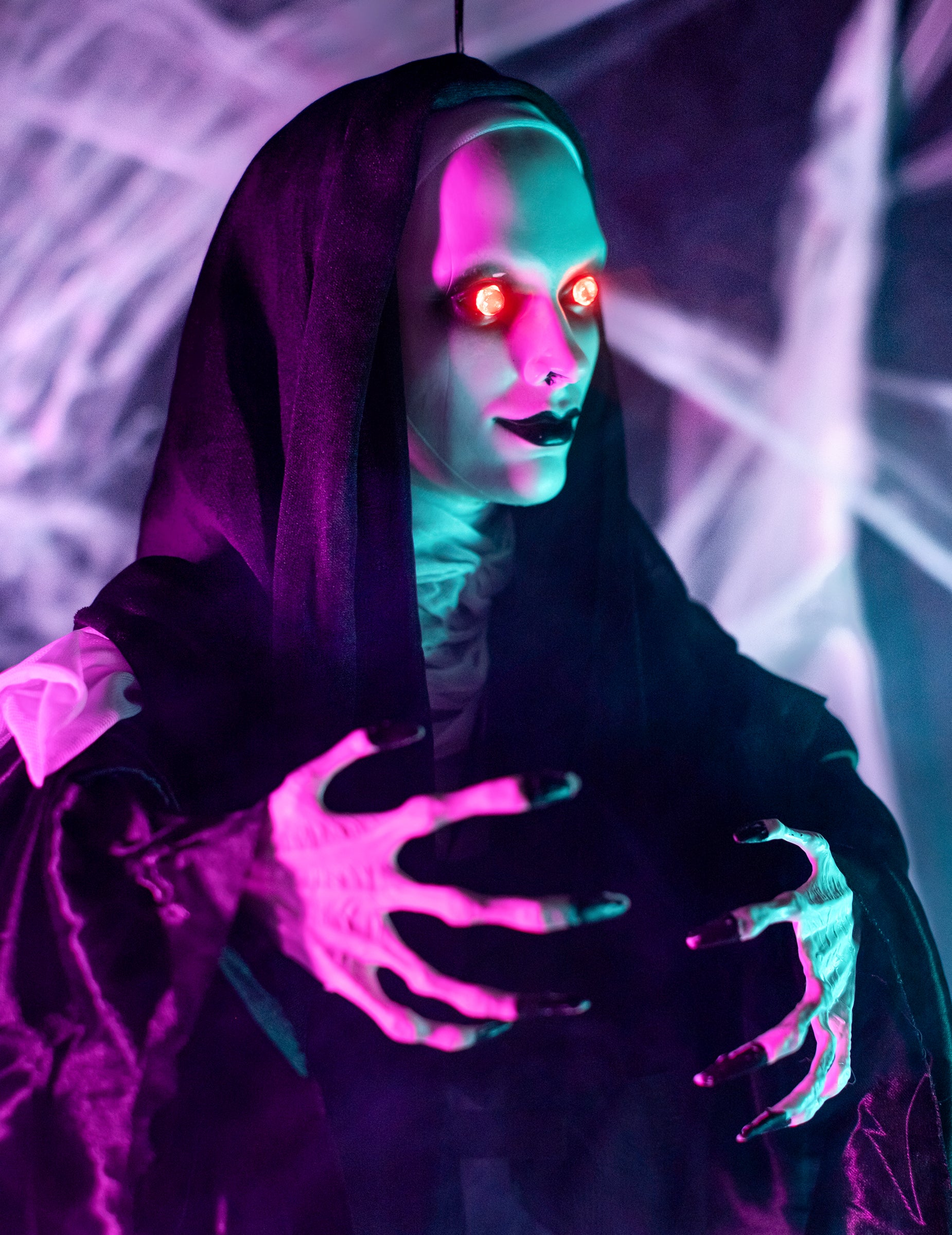 Ez a könnyű dekoráció kísérteties apáca. Ez körülbelül 120 cm hosszúságú. Az apáca arca fehér, szájjal és a fekete szemek kontúrjával. A csontváz kezek ugyanolyan sápadtak. Nyakláncot visel egy nagy fekete kereszttel. A szemek fényesek és megvilágítással vörösre válnak. 3 LR44 akkumulátorral működik. Ez a felfüggesztés tökéletes lesz a Halloween dekoráció kitöltéséhez.