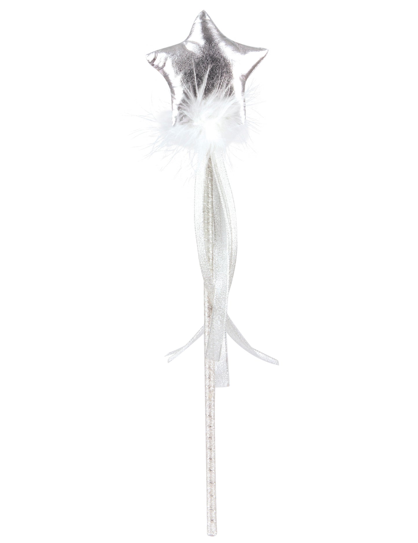 Ez a tündér pálca lánynak szól. Ennek a pálcának ezüst fogantyúja van. A tetején egy csillag fémes ezüst szövetben található. A csillag alapján szép, fehér toll van ezüst szalaggal. Ez a pálca lesz a tökéletes kiegészítő egy tündér vagy hercegnő jelmezhez a születésnapjára a mese témájáról.