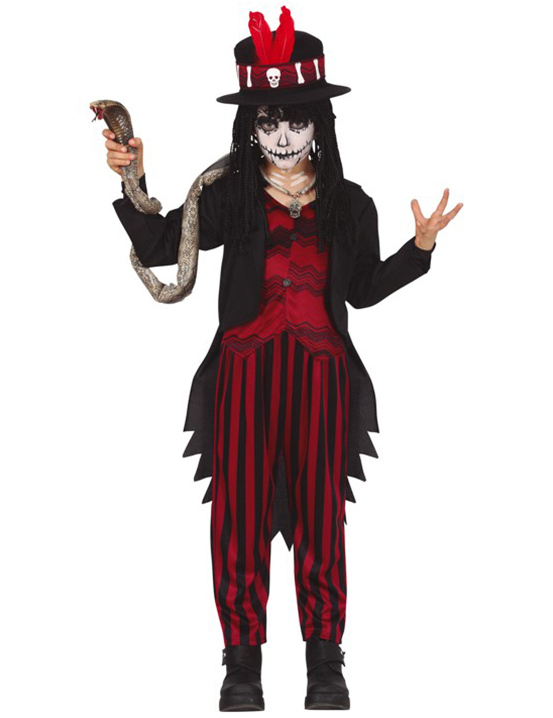 Ez a misztikus voodoo fiú jelmez tartalmazza a kalapot, a zakót az inggel, valamint a nadrágot (smink, cipő, kígyó és nyaklánc nem tartozék).