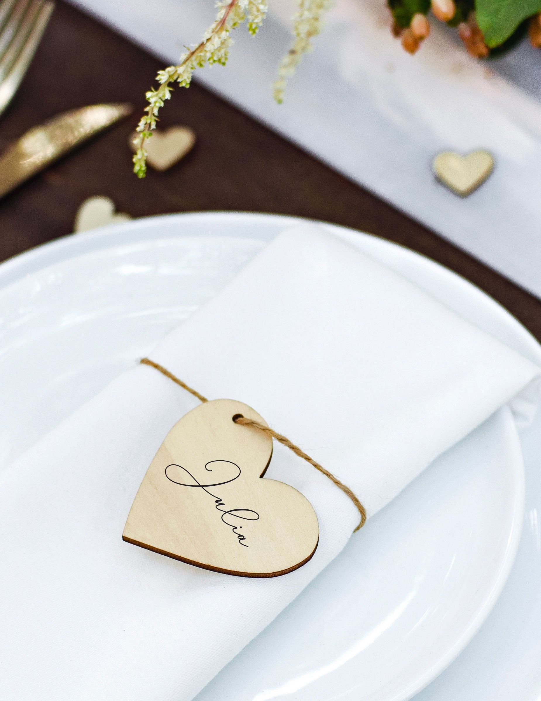 Ez a készlet 10 darabot tartalmaz fa ültetőkártyák eredeti formájában szív 6 x 5 cm. Zsinórral rögzíthetőek, így könnyedén felakaszthatod őket a poharadra vagy szalvétádra. Ezek a natúr színű tartók tökéletesek egy... esküvői asztaldíszek stílusosan természetRusztikus vagy bohém. Javasoljuk, hogy golyóstollal írja fel a vendégek nevét, hogy elkerülje a fafelületen való elmaszatolást.