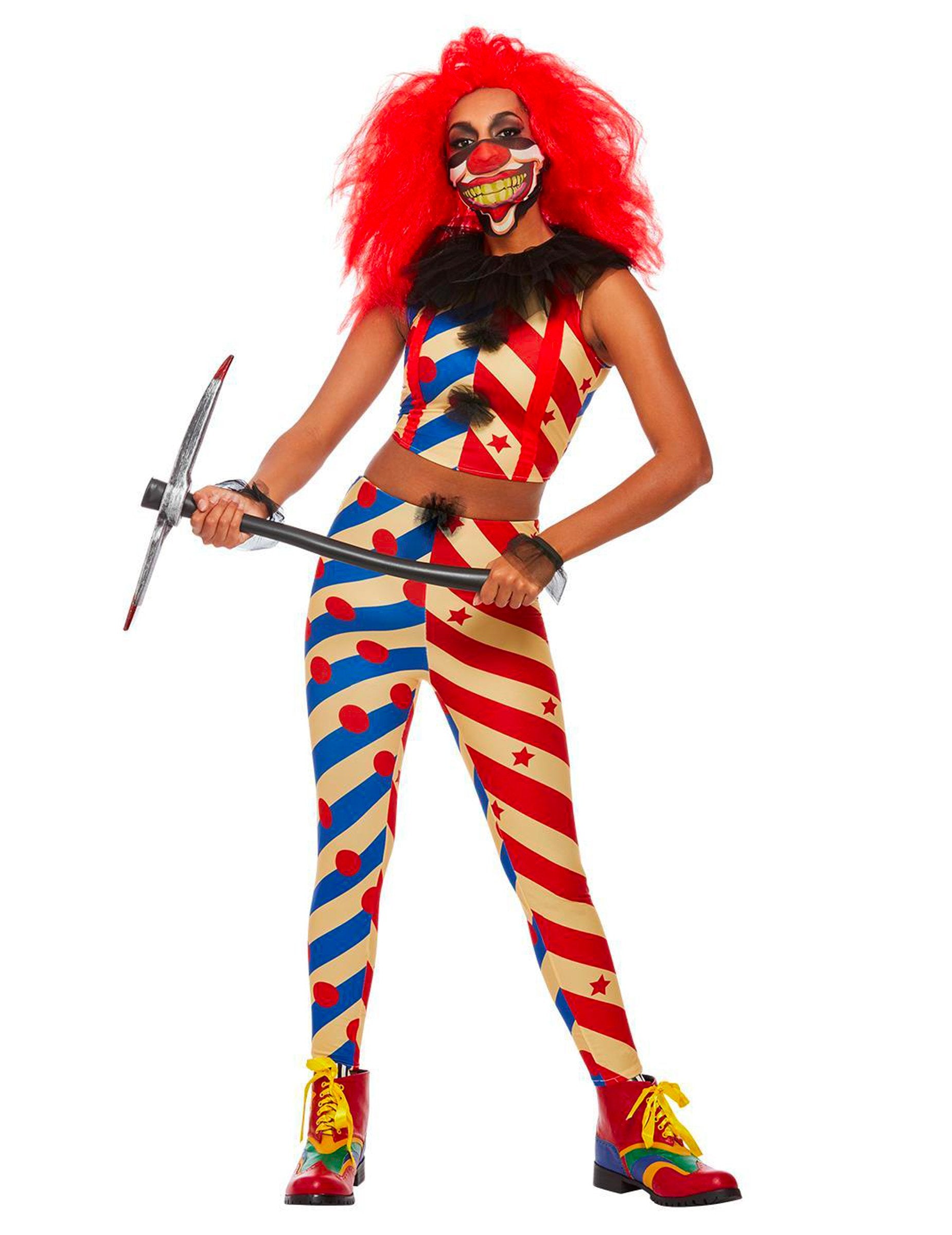 Ez a hátborzongató bohóc jelmez a nők számára szól, és egy nadrág, karkötő és egy maszk tetejéből áll (paróka, cipő, fejsze nem tartozik). A tetején a fehér és a piros csíkok egyik oldalán van, csillagokkal, a másik oldalán a fehér és a kék csíkok körökkel. Egy függőleges piros sáv díszíti, amely benyomást kelt a harisnyatartók viselésére. A tetején fekete tüll színű gallérral rendelkezik. A nadrág ugyanazok a színek, mint a felső. Kék, fehér és piros csíkokkal rendelkezik, csillag és kerek mintákkal. A méretközpontot egy kis fekete tüll díszíti. A maszk chache orr, és a bohóc orrát és száját képviseli. Nagy mosolyt mutat, amely feltárja a sárga fogait. Az álruhában fekete tüll karkötők vannak, amelyek a tetejének magasságára emlékeztetnek. Fremate barátait ezzel a hátborzongató bohóc álruhával a Halloween estéjén!