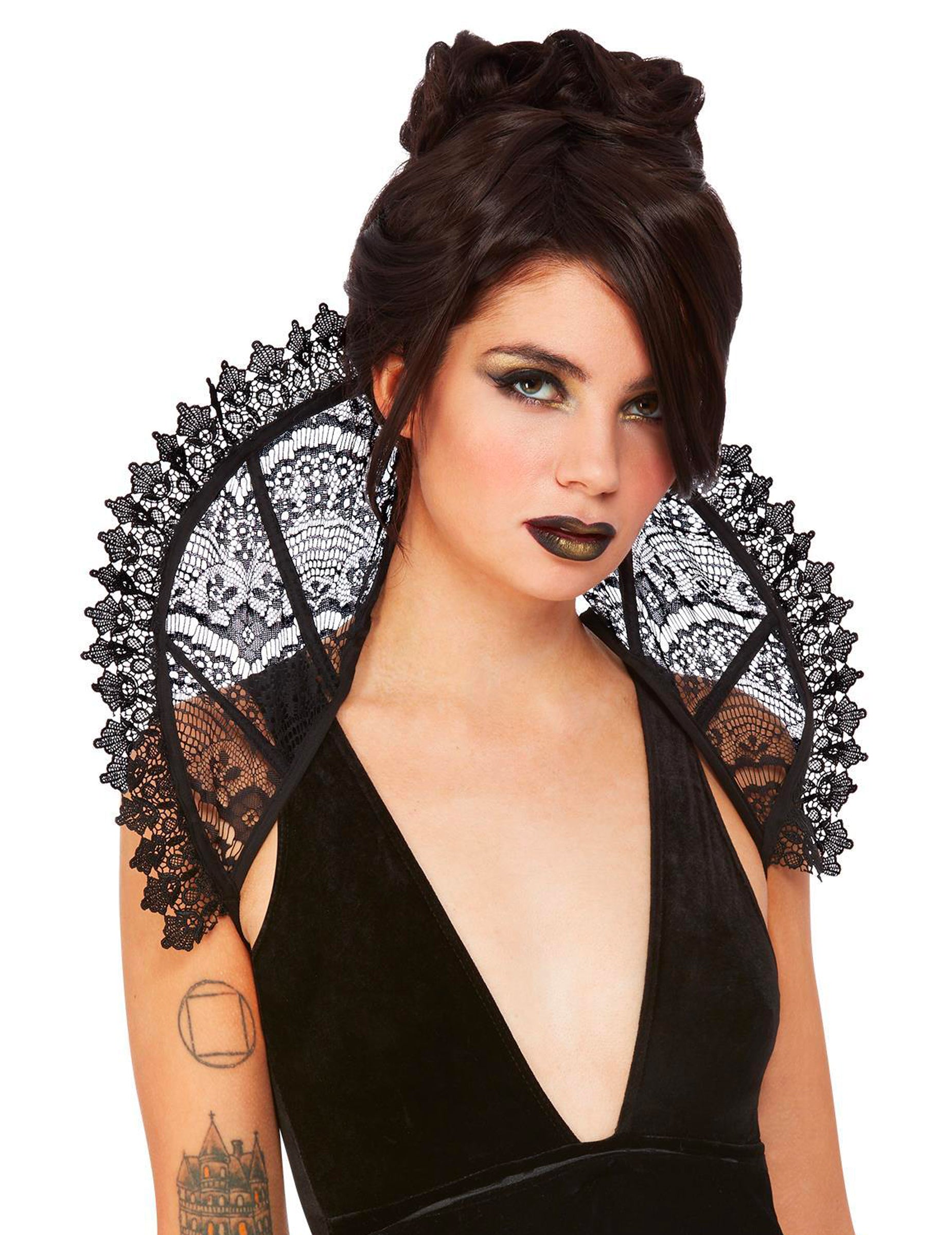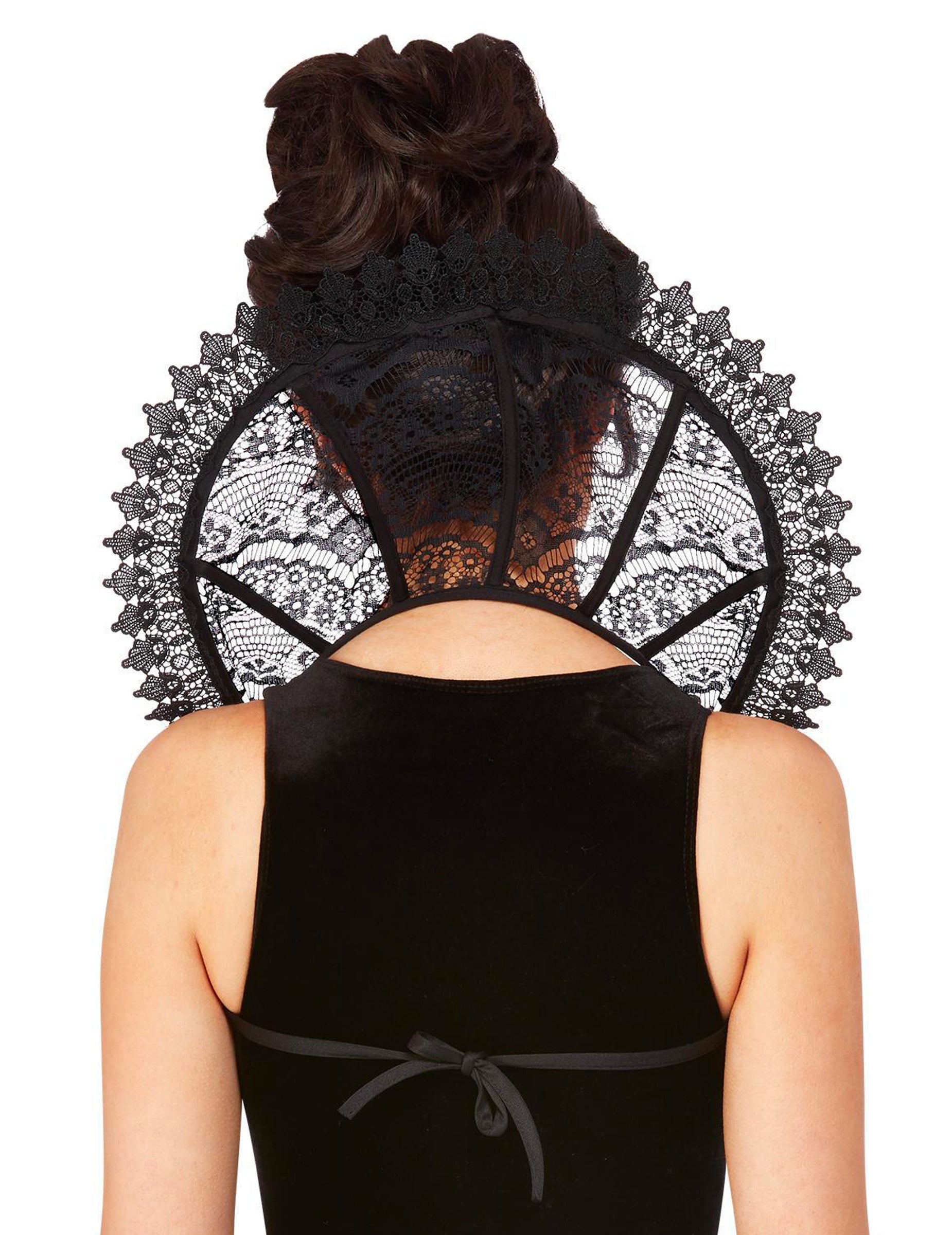 Ez a fekete csipke gallér a nők számára készült. Ezt a gallérot a vállakra kell helyezni. A karok alá és a háthoz való rögzítéshez szükséges link biztosítja a jobb gallér jó támogatását. A merev megerősítések fenntarthatják ennek a gallérnak a alakját. Kiváló gallér sok álruhát, például gótikus, vámpír, gonosz boszorkányt a Halloween estén.