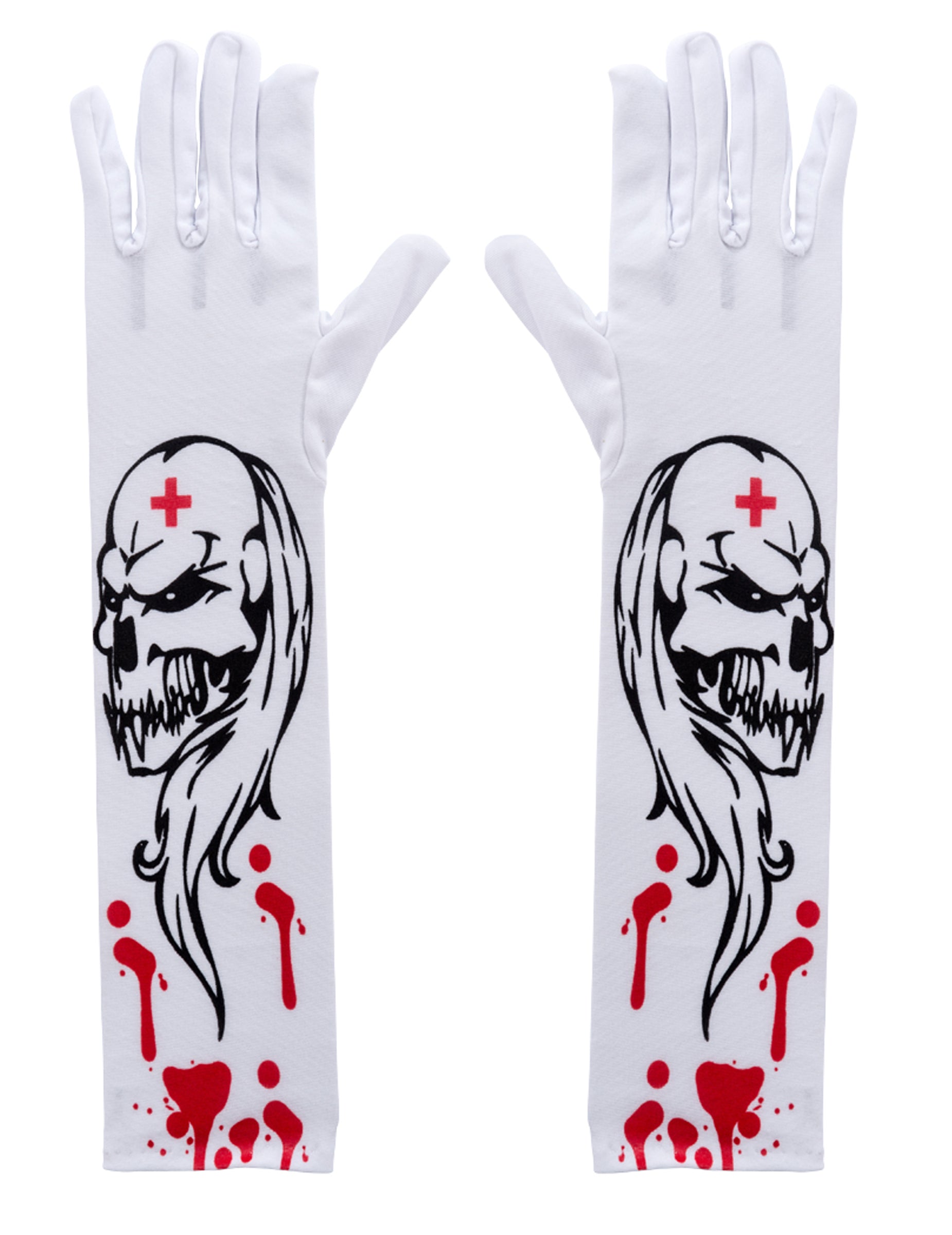 Ez a pár kesztyű felnőtteknek szól. Ezek a fehér kesztyűk közepes hosszúságúak. Ezeket egy hosszú hajú zombi fejjel, vörös kereszttel nyomtatják. Hamis vérfoltok. Ezek a kesztyűk tökéletesek lesznek a Halloween jelmezek hozzáféréséhez.