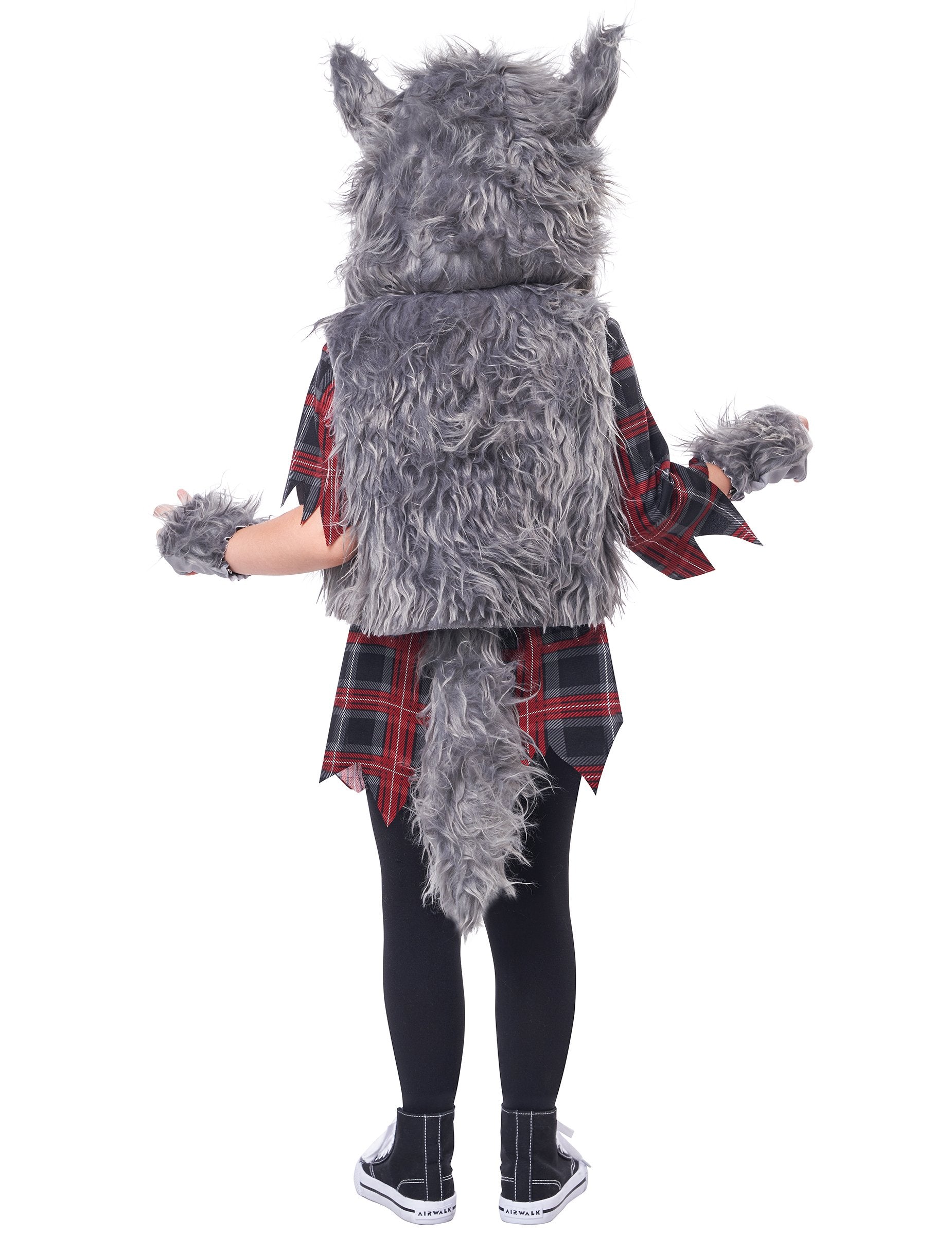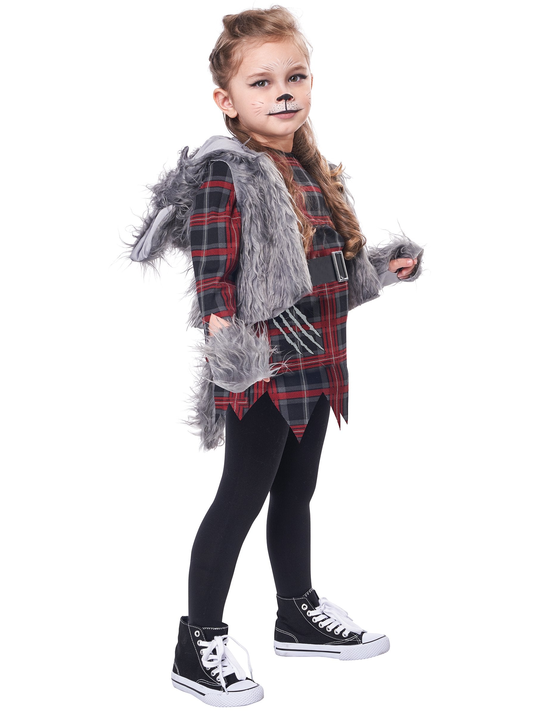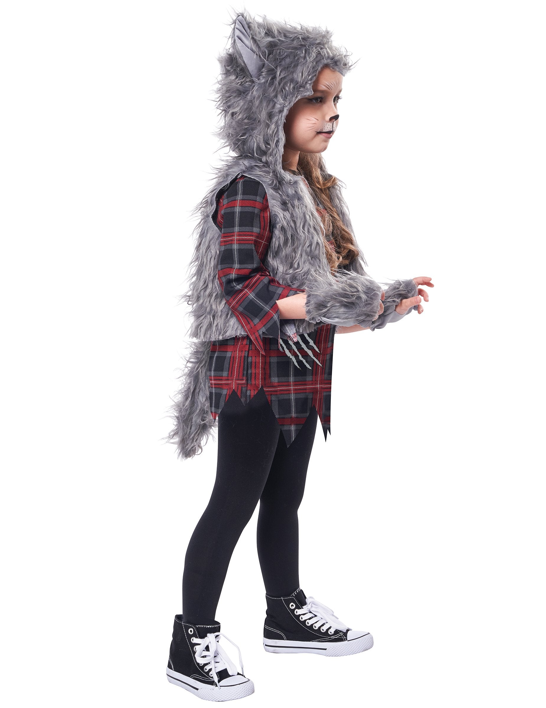 Ez a lány számára ez a farkas álruhás kapucnis mellényből, tunikából, farkú övből és egy pár ujjatlan (harisnyanadrág és cipő nem tartozik). A rövid ujjú tunika kockás. A karcolási nyomokat szintén nyomtatják rá. Ezt egy nagy fekete öv kiegészíti, amelyen egy szürke hajfark van rögzítve a hátsó részben. Az ujjatlan mellény szürke haj. A motorháztetőt szintén rögzítik ezen a mellénynél. A feje tetején farkas füle van. Végül, a szürke hajózott ujjatlan kesztyű kitölti ezt a jelmezt. Ez az álruhás tökéletes lesz az édességvadászat vadászatához Halloween estén.