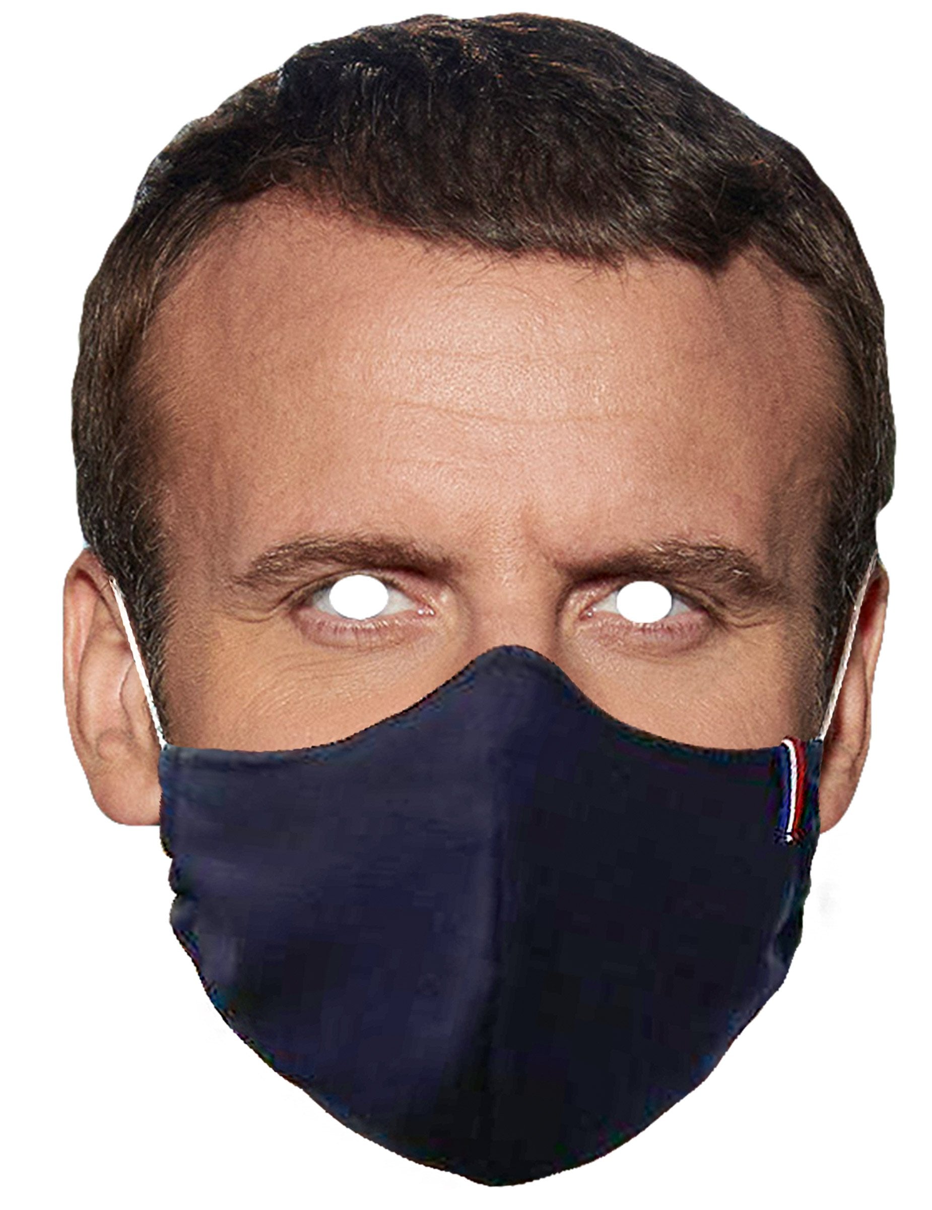 Ez a felnőtt maszk lapos kartonból készül. Ő képviseli a francia elnök, Emmanuel Macron, a Portan A maszk arcát. A nyílások a szemének szintjén vannak jelen. Ezt a maszkot rugalmassággal viselik. Kiválóan alkalmas arra, hogy utaljon a koronavírussal tapasztalt egészségügyi válságra.
