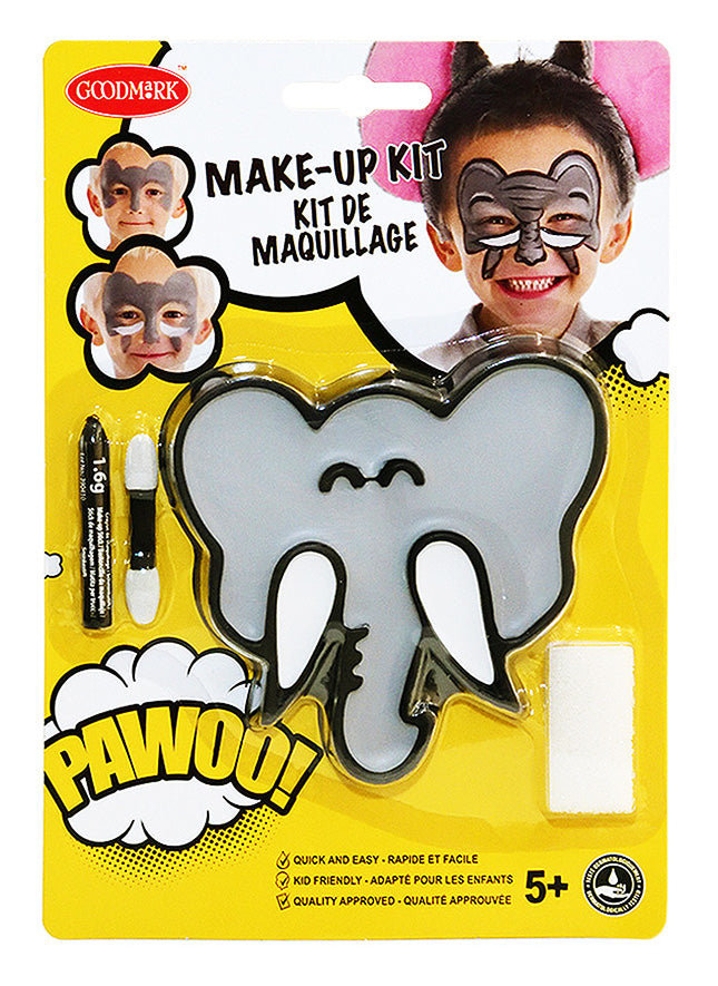 Ez az elefántos arcfestő készlet gyerekeknek készült, és tartalmaz egy 1,6 g-os fekete zsírkrétát, egy 7,5 g-os szürke és fehér arcfesték palettát, egy szivacsot és egy applikátort.