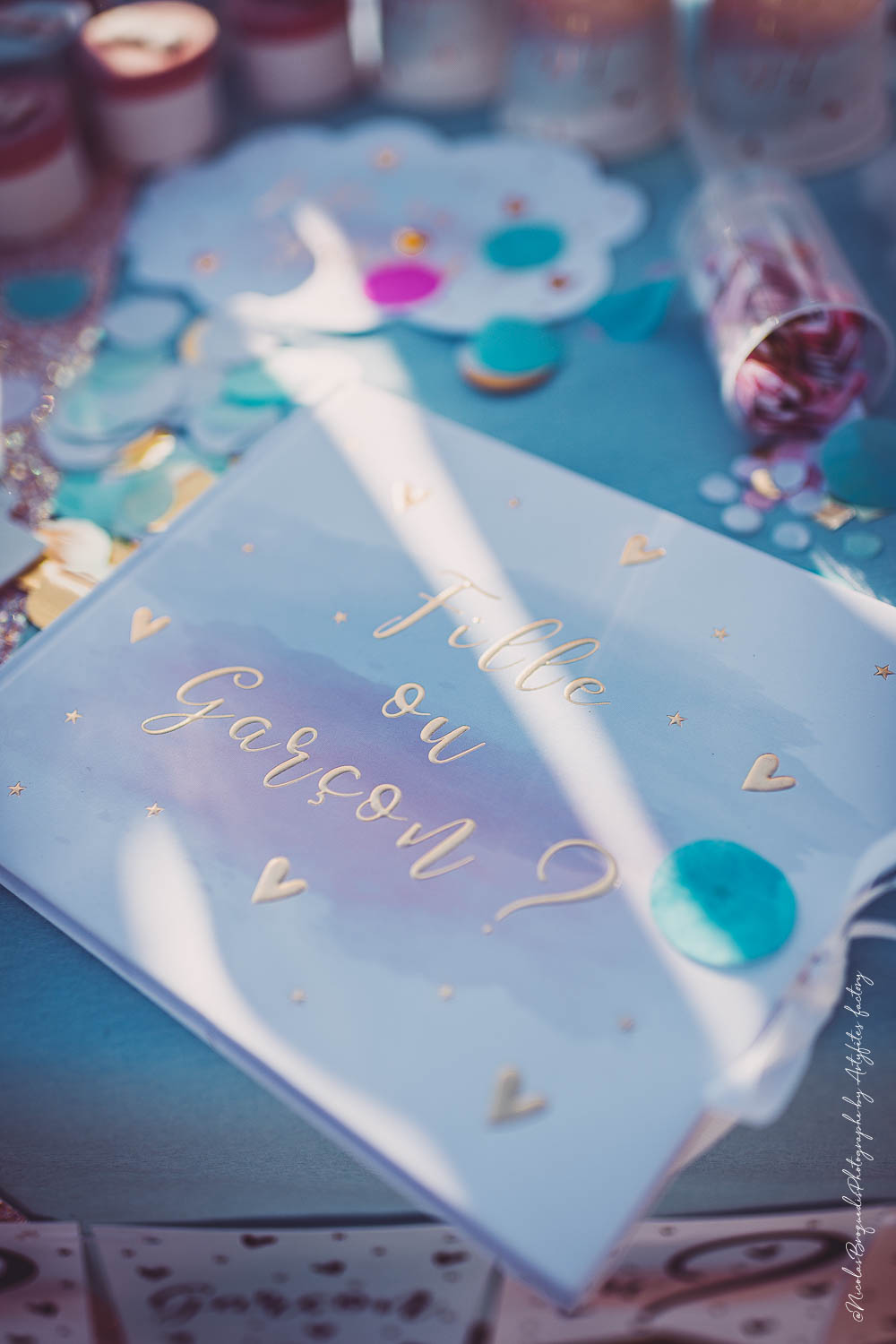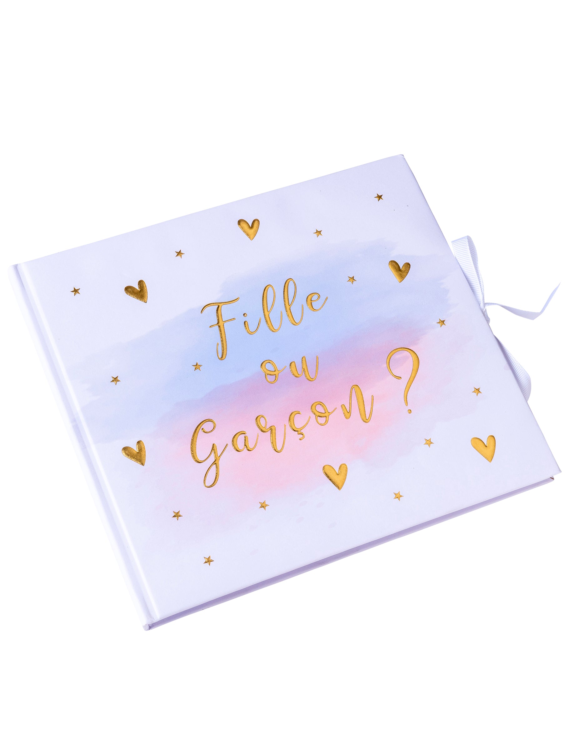 A borítón a kérdés szerepel: "Lány vagy fiú?"Elegáns aranybetűkkel írva. Egy fehér szaténszalag finoman zárja a könyvet."
