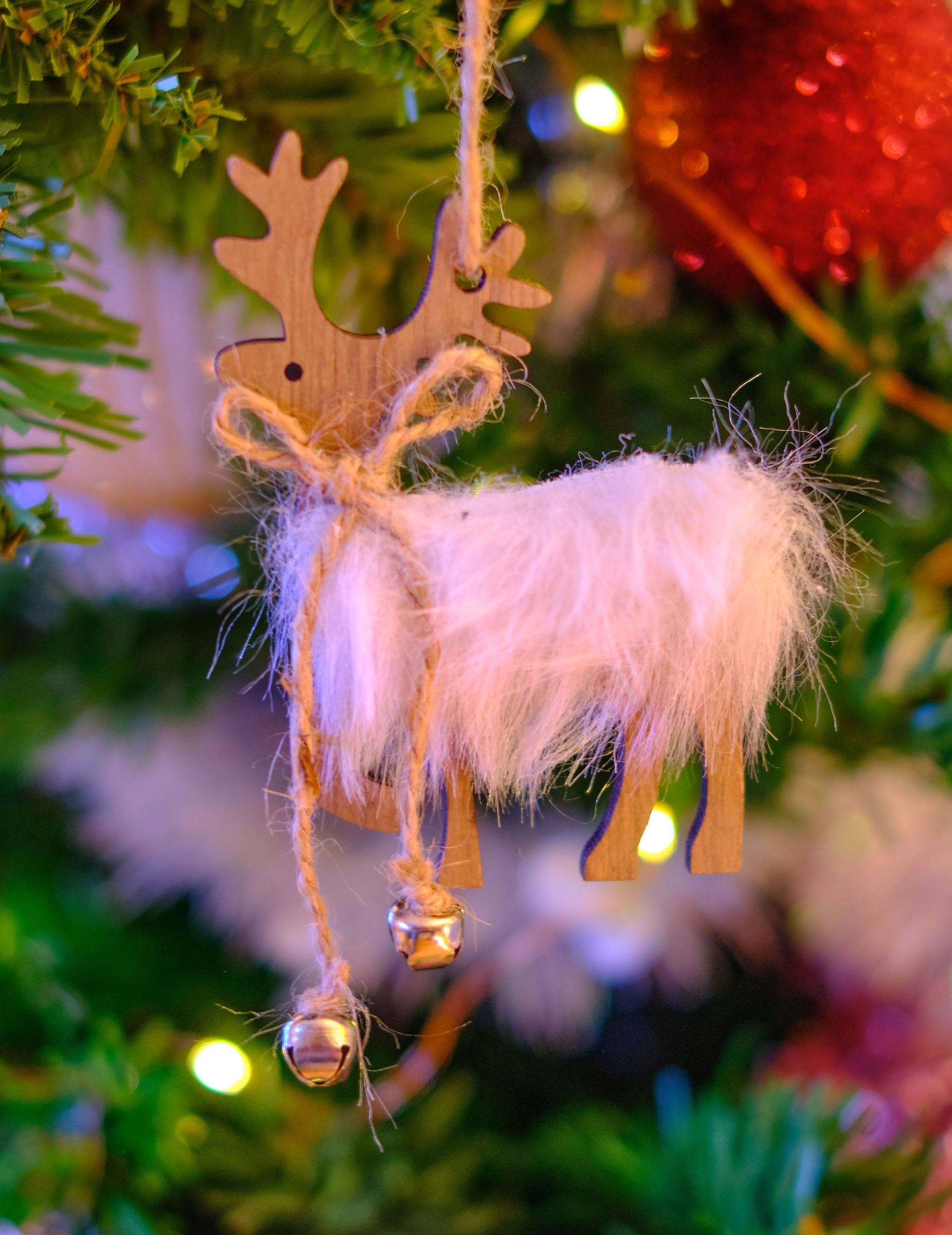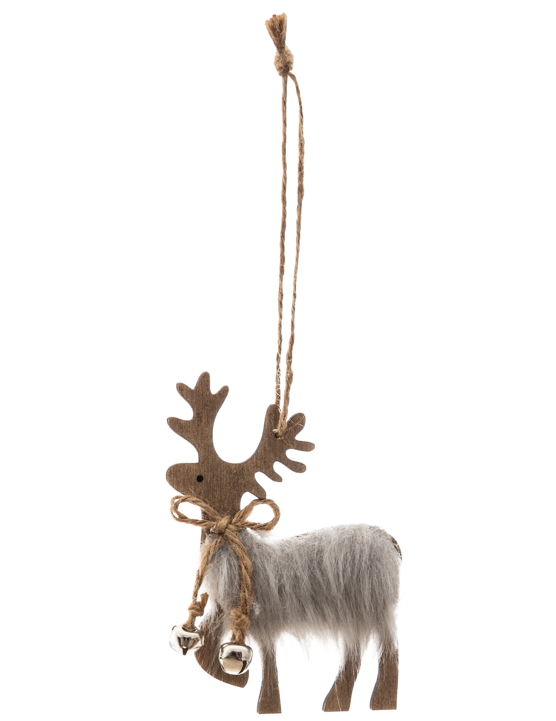 Ez felfüggesztés fából készült, 11 cm Ez a kis apróság tökéletes kiegészítője lehet otthonod feldíszítésének. rénszarvas Masnival és finom csengőkkel díszítették. A szőrme színe, amely szürke vagy fehér színben kapható, véletlenszerűen kerül elküldésre. Helyezd ezt a díszt a... fenyőfa egy díszítéshez karácsonyi édes és varázslatos.