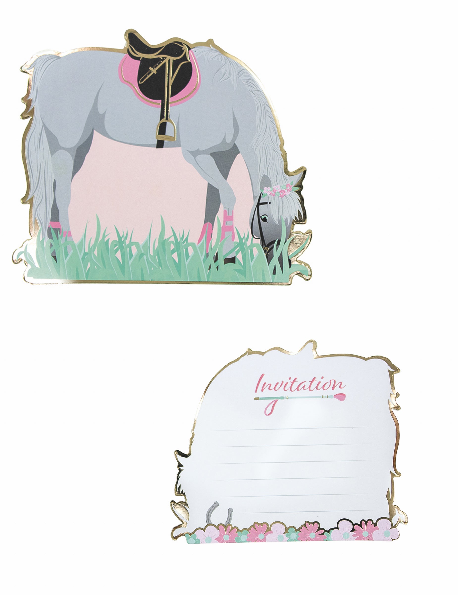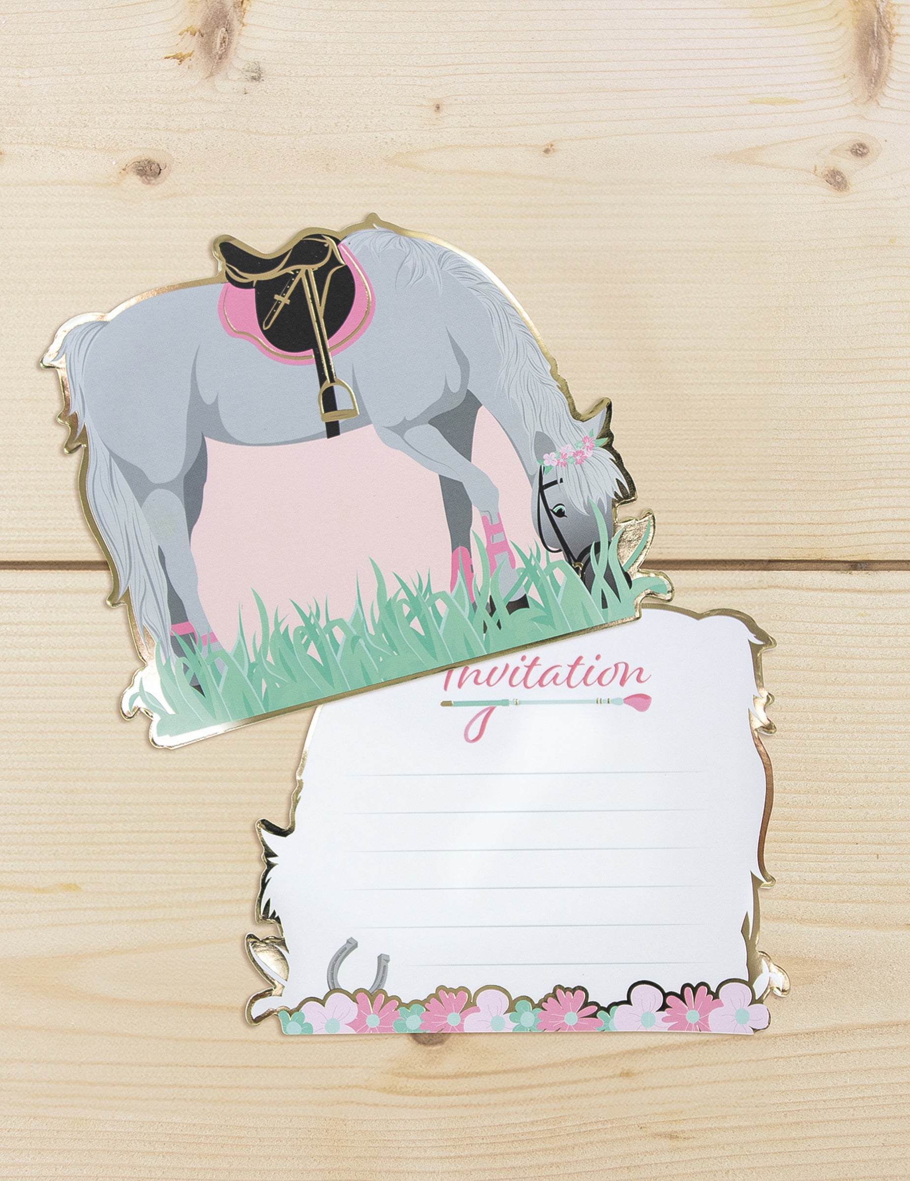 Ez a tétel 8 darabból áll meghívók körülbelül 13 méteres cm. Az elejét egy ló Szürke legelésző egy réten, míg a hátoldal az ünneplés részleteinek leírására szolgál. meghívók megengeded a lányodnak, hogy meghívja a barátait egy születésnap a lovaglás témájában.