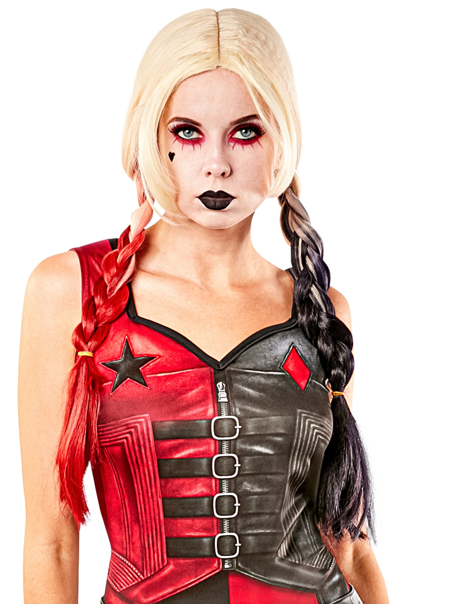 Ez a Harley Quinn paróka nőknek szól. A hivatalos Suicide Squad 2 licenc alatt a paróka szőke a gyökereken, és 2 zsinórral rendelkezik, az egyik fekete, a másik pedig piros. Integrálja az Suicide Squad csapatot a Harley Quinn lejátszásával ezzel a Harley Quinn parókával Halloween alatt vagy a kedvenc filmjeid szereplőinek témája során!