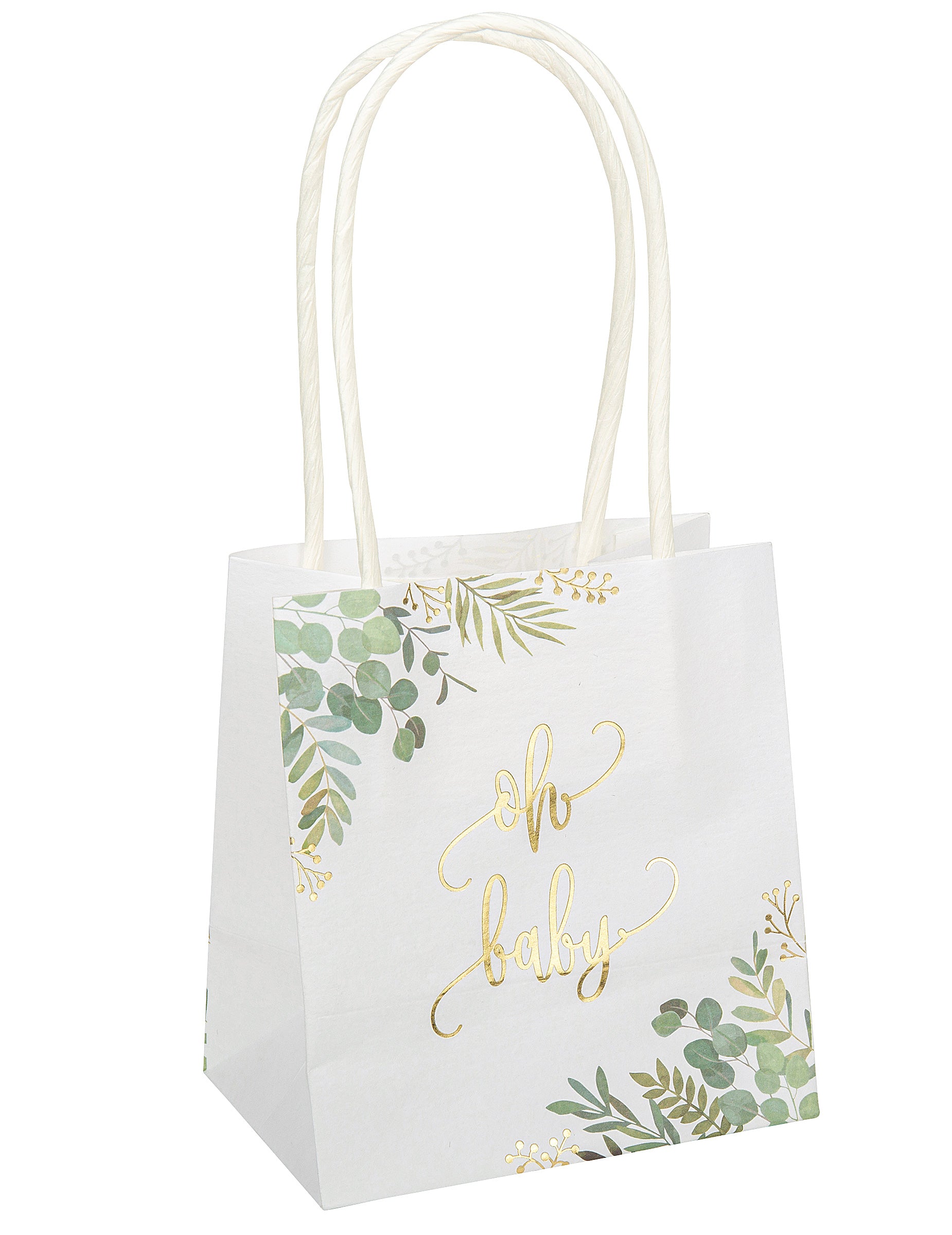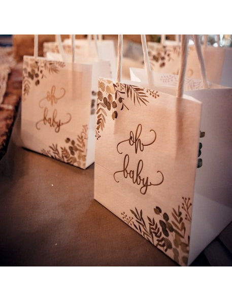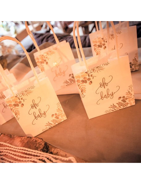 Ez a 6 darabos készlet ajándéktáskák Ideális a születés stílusos megünnepléséhez. Méretek: 10 x 18 x 5 cm, Ezeket a fehér dobozokat botanikai motívumok és arany "oh baby" felirat díszíti. Nagy fogantyúkkal vannak felszerelve a könnyű hordozás érdekében. tasakok tökéletesen tárolja a cukrozott mandulát vagy az apró ajándékokat egy babaváró buli tematikus.