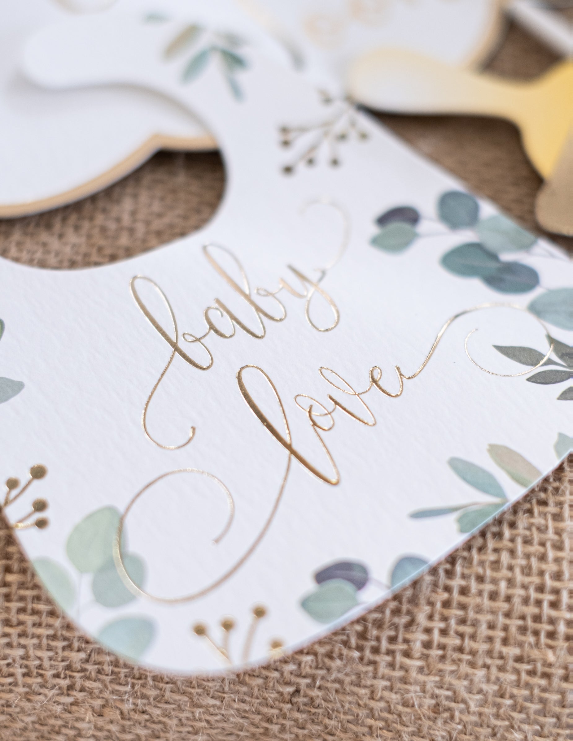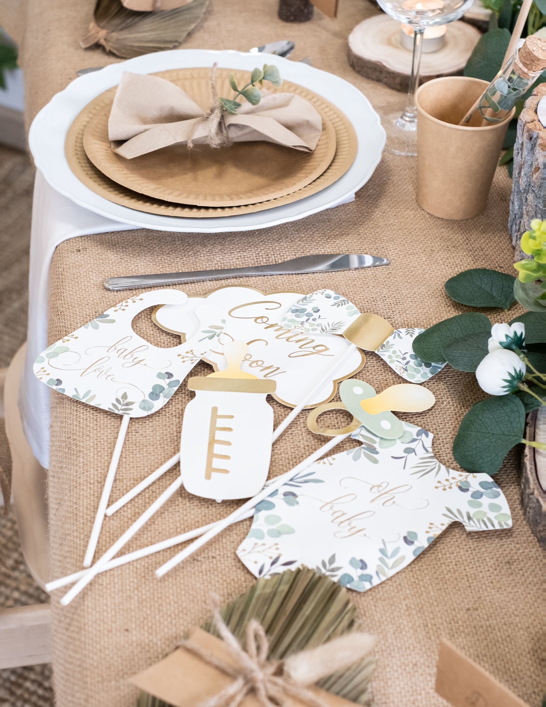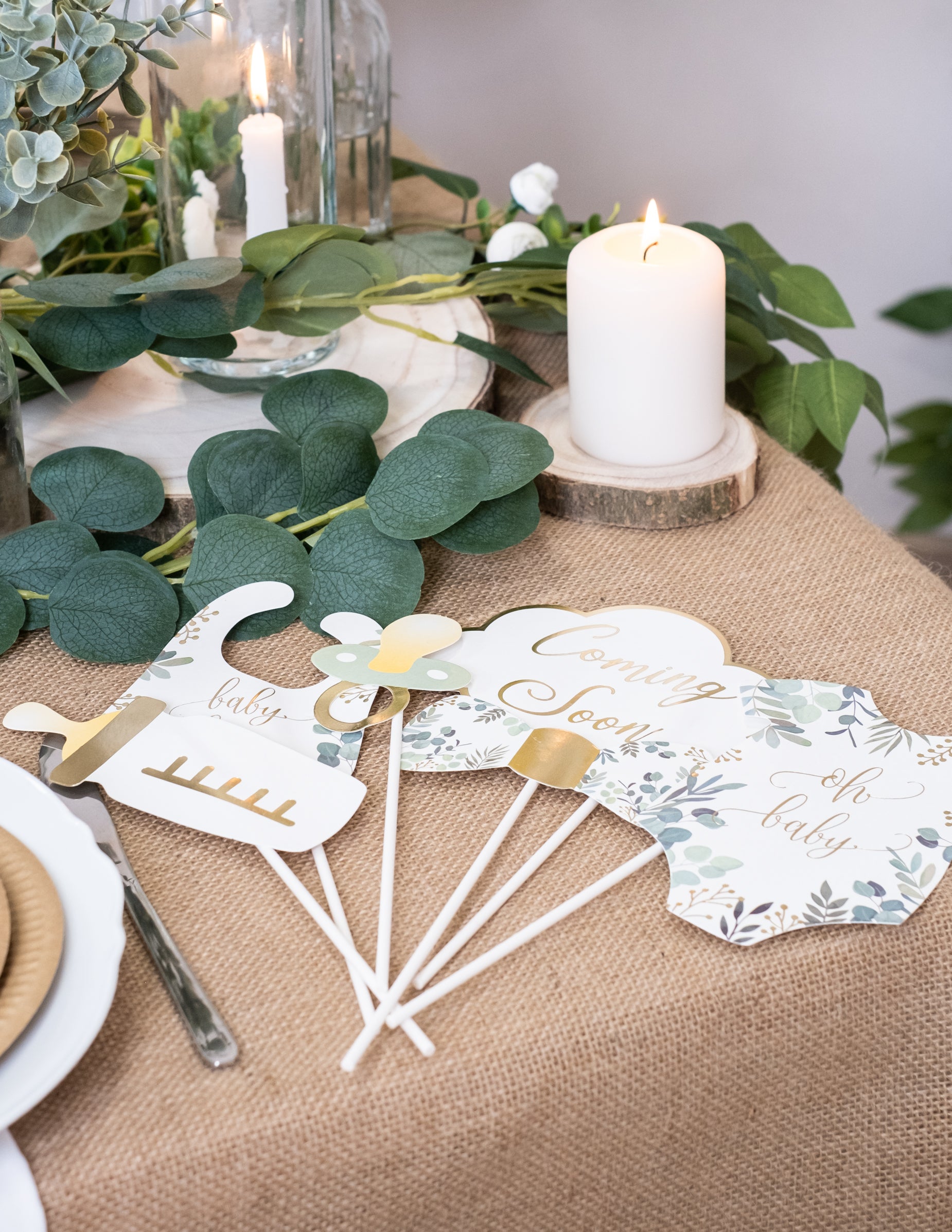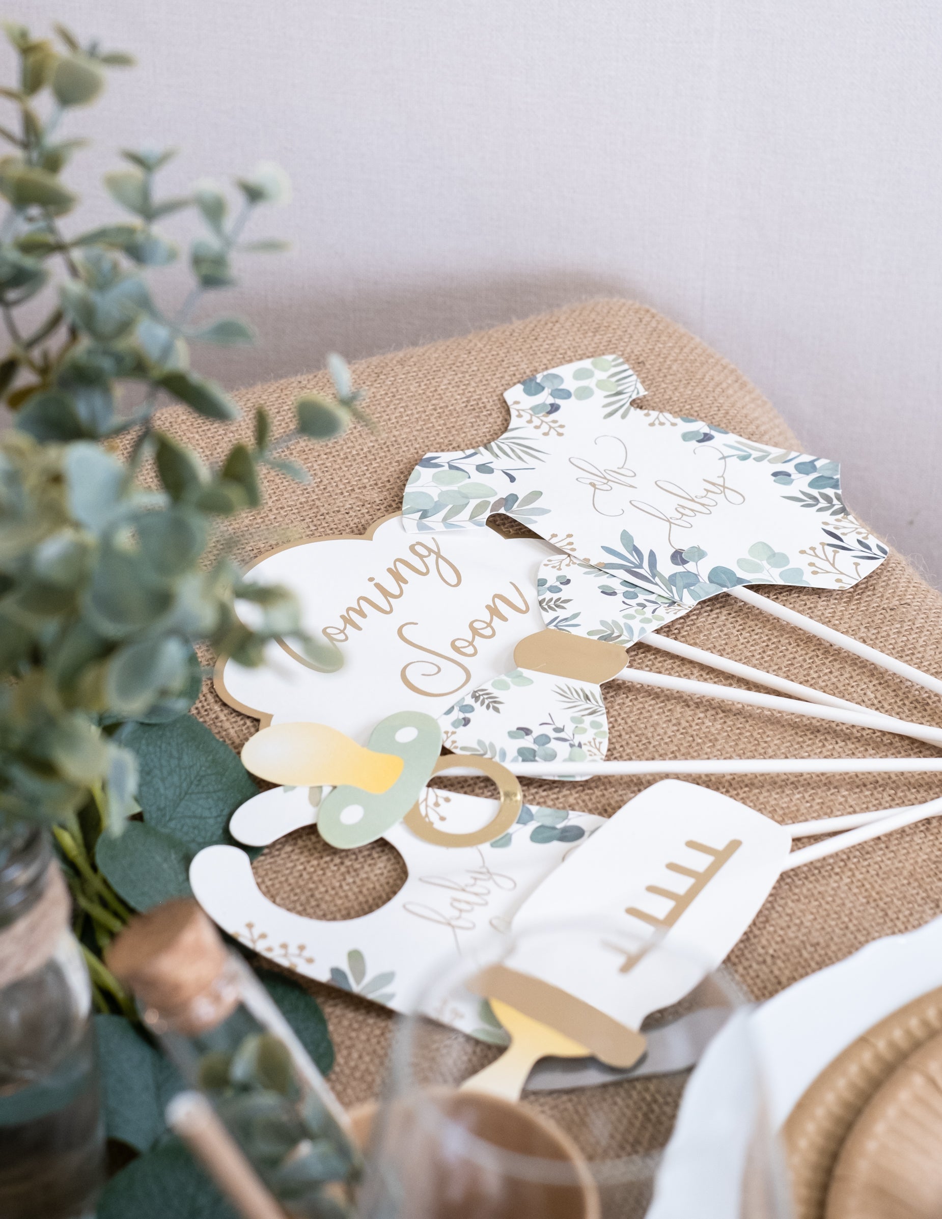 11 darabos fotófülke készlet "Oh Baby" eukaliptusz és arany kiegészítőkkel babaváró bulira