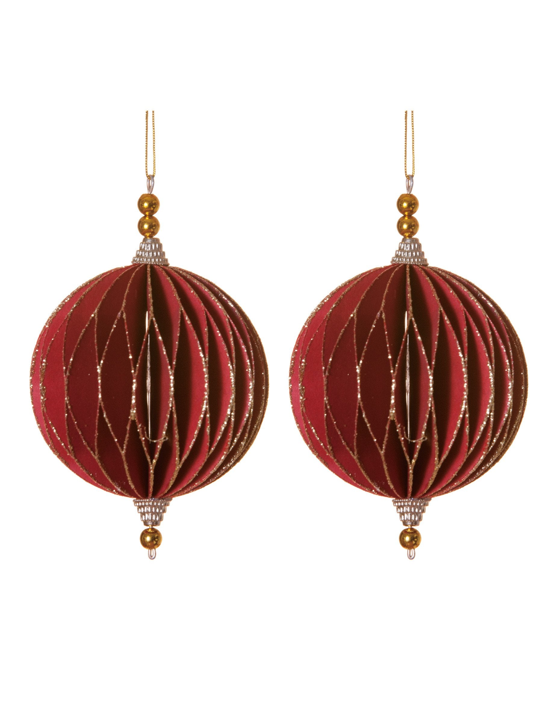 Ez a készlet kettőt tartalmaz felfüggesztések hajtogatott papír 13 cm átmérőjű. Elegáns origami stílusú díszek, vörös és arany árnyalatokkal, hogy feldobják otthonát. Ideális kiegészítők a... karácsonyfa egy csipetnyi eredetiséggel.