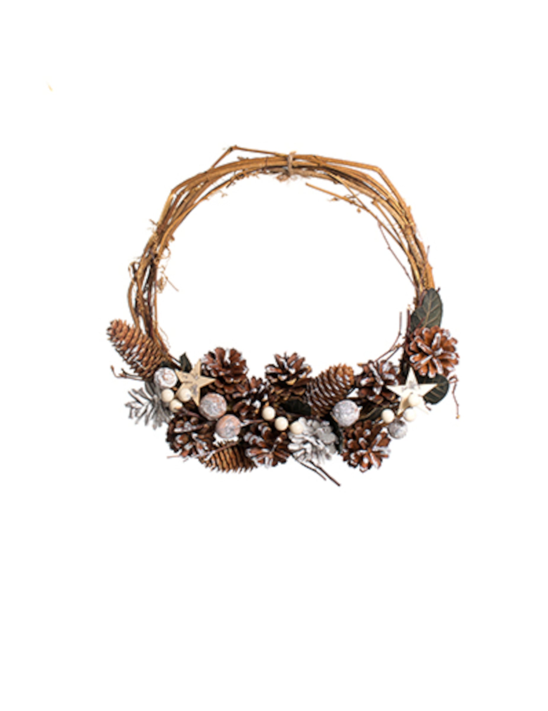 Cette couronne décorative se compose d'un support en osier de 30 cm de diamètre environ. Elle est joliment ornée de pommes de pin à l'effet givré, de petites boules ainsi que d'étoiles. Prête à être installée grâce à sa fine cordelette, cet accessoire est parfait pour créer une ambiance de Noël naturelle et féerique dans votre intérieur.