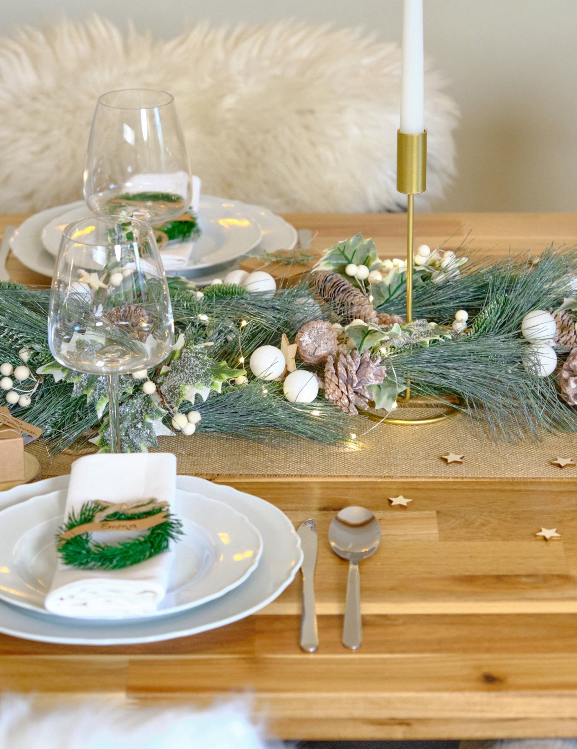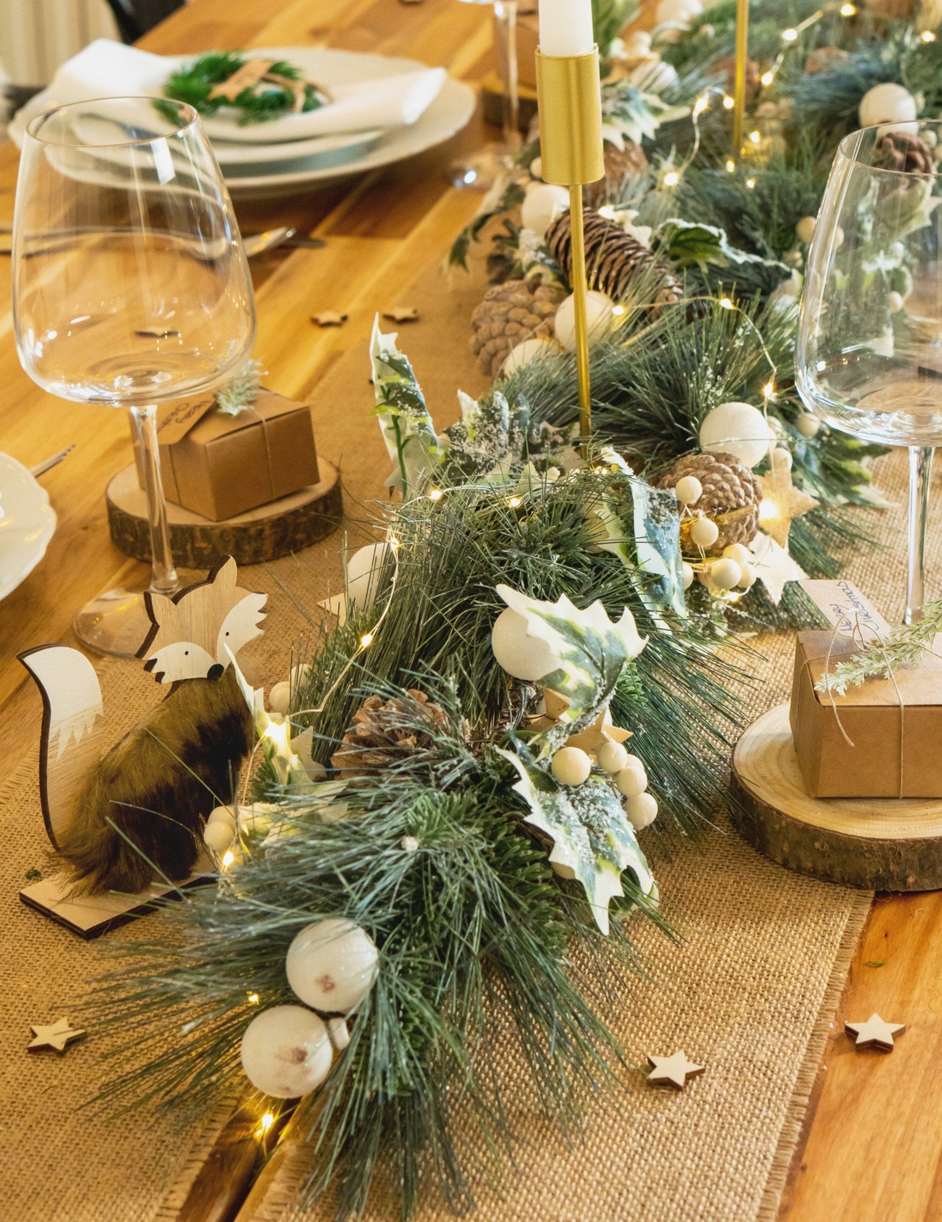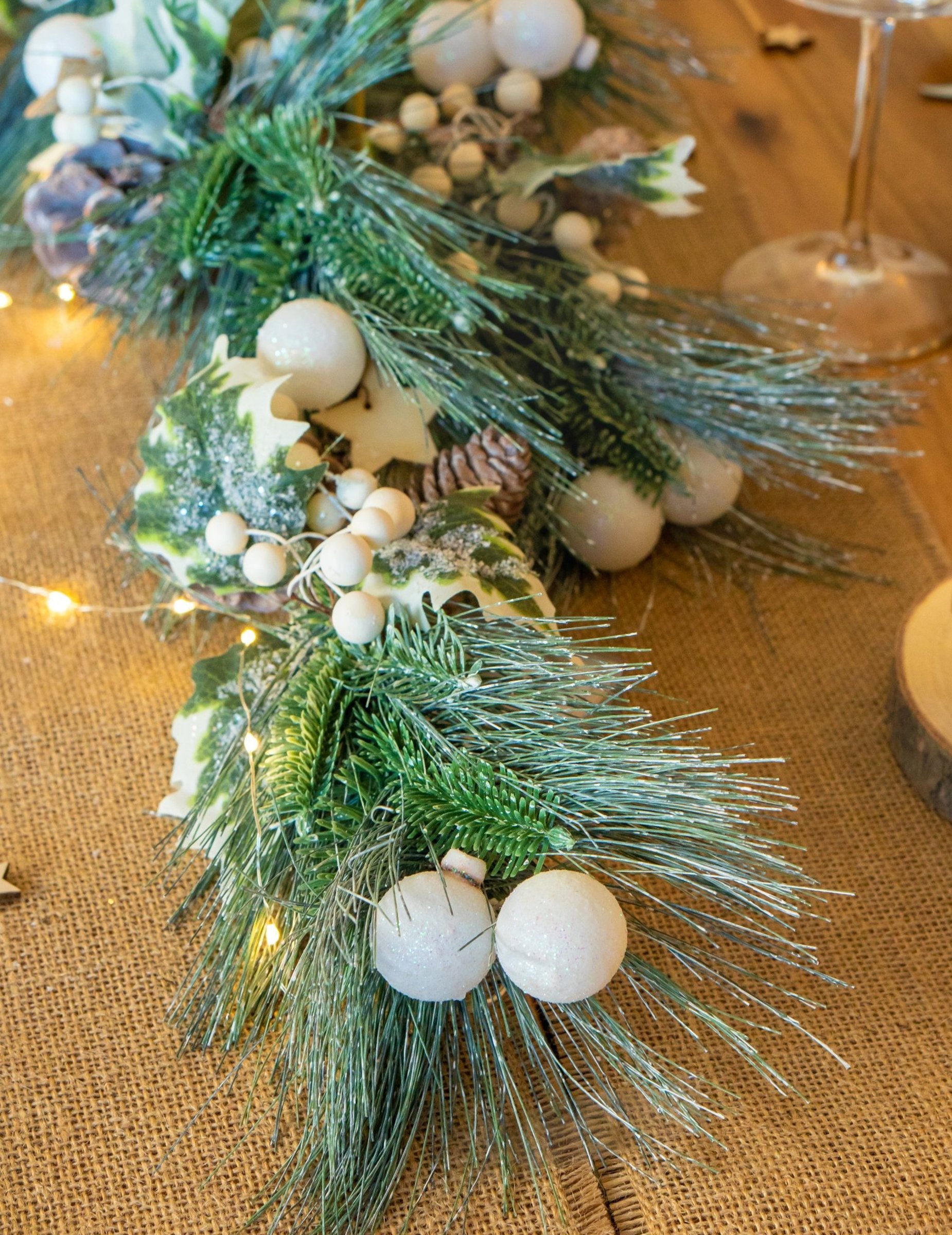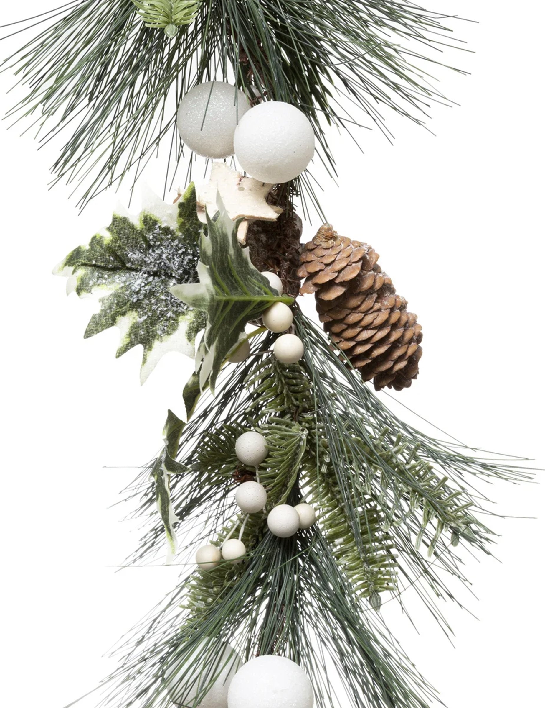 Ez a Garland körülbelül 1 m hosszú. Fir ágakból, levelekből, fenyőtobozokból, csillagokból és kicsi pezsgő fehér dekorációkból áll. Ez a Garland természetes kapcsolatot fog adni a karácsonyi dekorációnak!