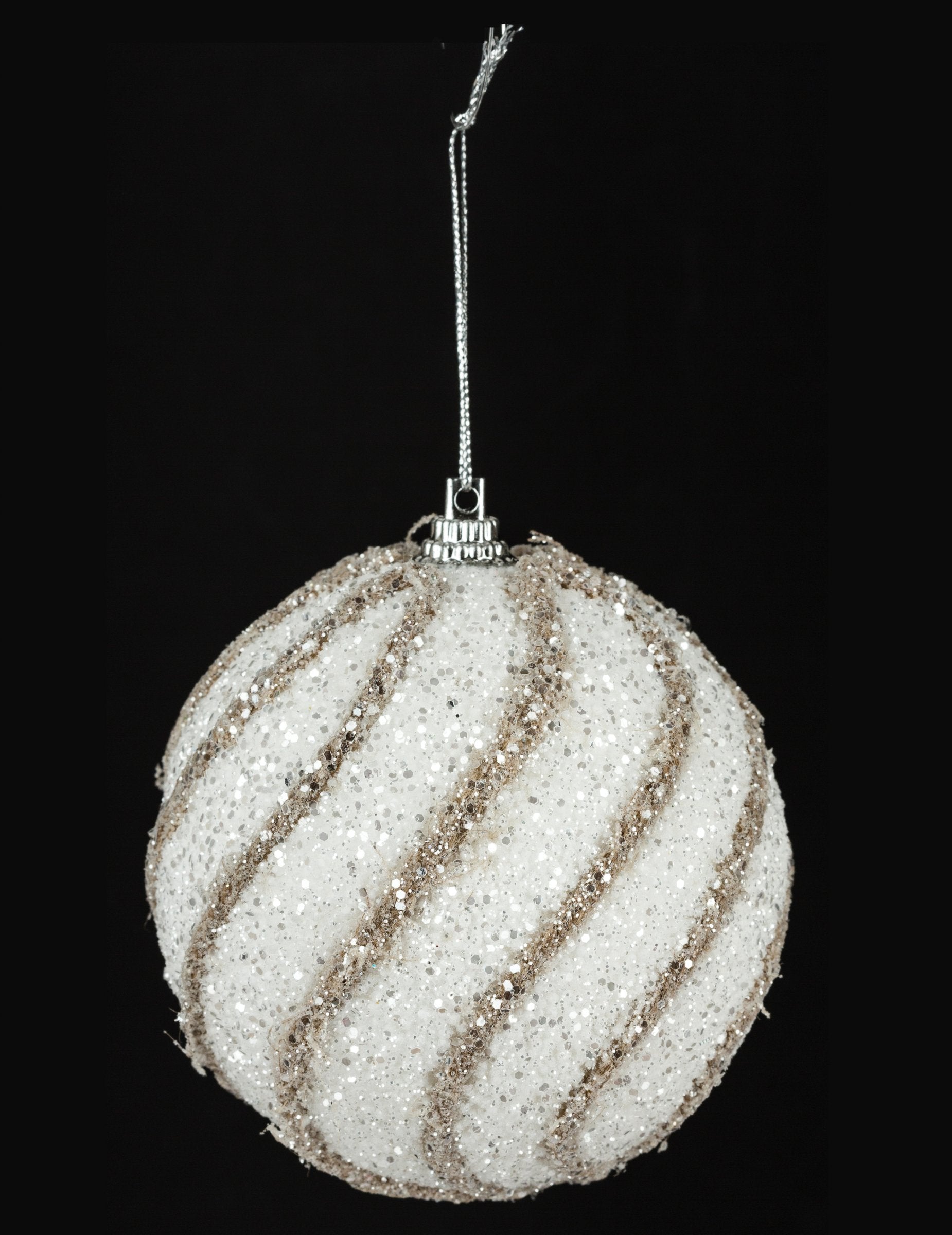 A karácsonyi golyó átmérője körülbelül 8 cm. Feltenyészettel és fehér és arany spirális sávokkal díszítik. Ezzel a labdával töltse ki a karácsonyi dekorációját egy varázslatos témáról!