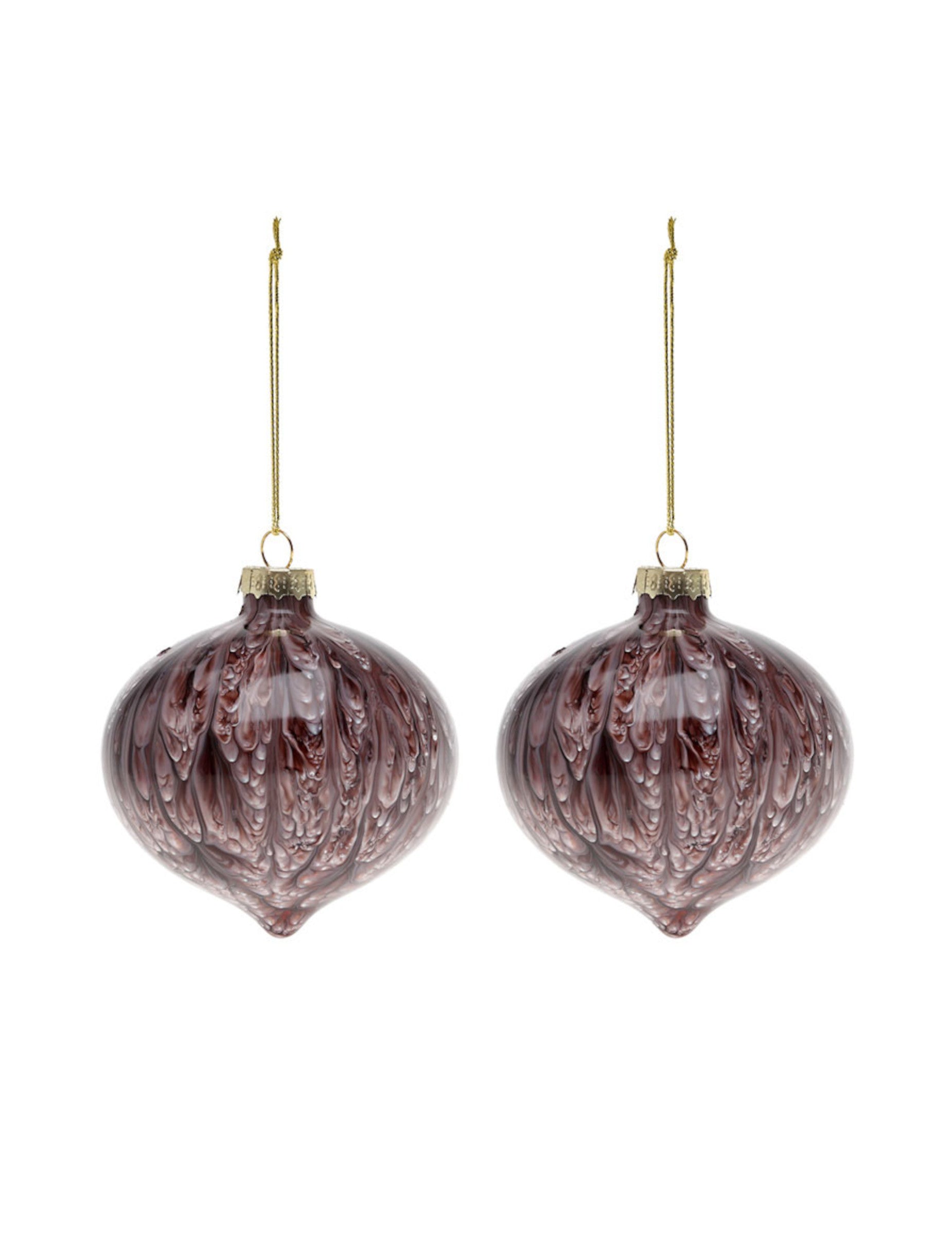 2 darabos szettben kaphatók, ezek karácsonyi gömbdíszek körülbelül 8-as mérés cm átmérőjű. Barna színű üvegből készültek, márványozott mintázatuk a fakéreg textúrájára emlékeztet. Ideális kiegészítők a karácsonyfa hiteles és természetes érintéssel.