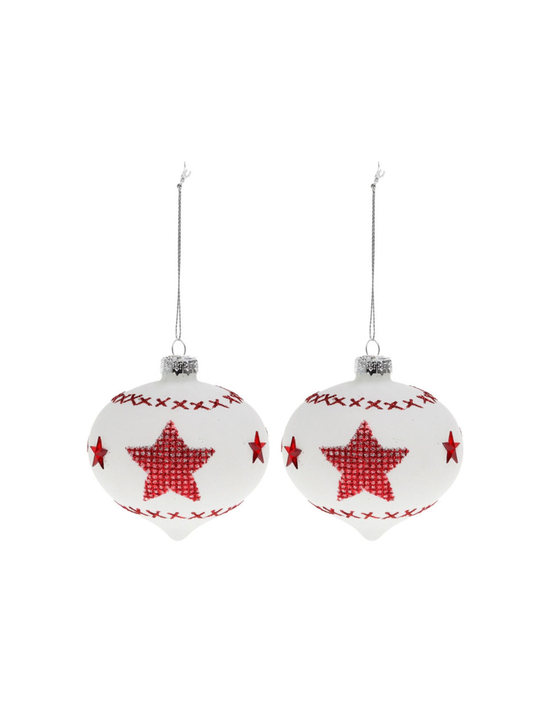 Ez a 2 darabos készlet karácsonyi gömbdíszek az üveg mérete körülbelül 8 cm átmérőjűek. Tiszta fehérek, és kontrasztos vörös csillagmintázatukról ismertek. Ezek fehér és piros golyók tökéletesen integrálható egy karácsonyfa hagyományos megjelenéssel a sikeres partihangulatért.