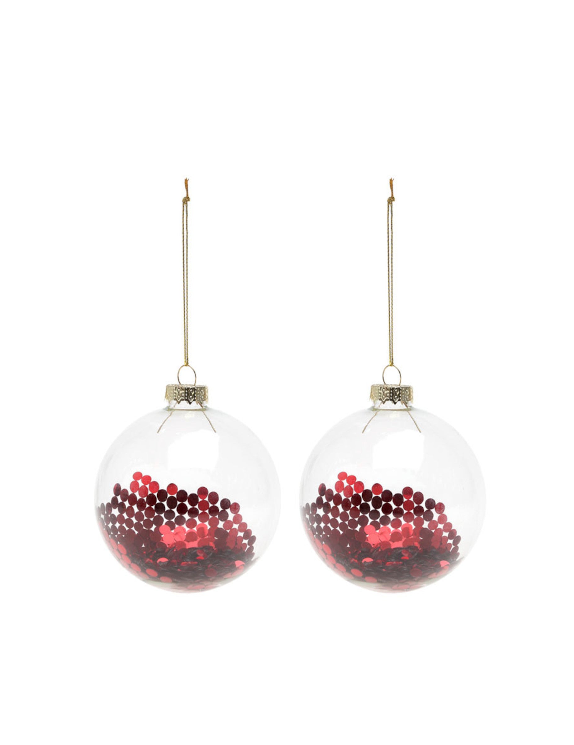 Ez a tétel kettőt tartalmaz labdák Áttetsző üvegből készült karácsonyfadíszek. Minden darab átmérője 8 cm és csillogó hatású, szép piros csillámot tartalmaz. csillogó golyók csillogást és eleganciát visz otthonába karácsonyfa az ünnepi időszakban.