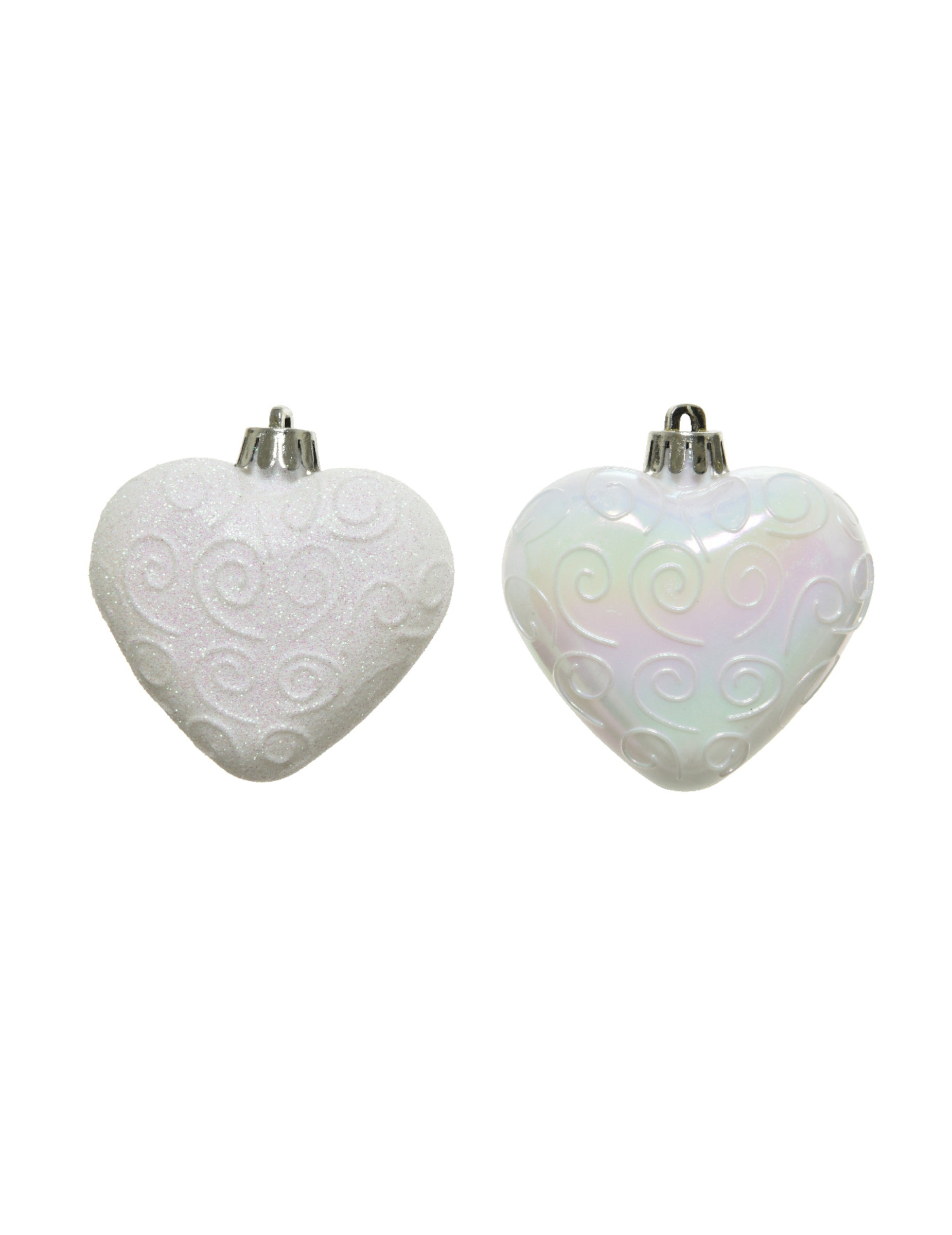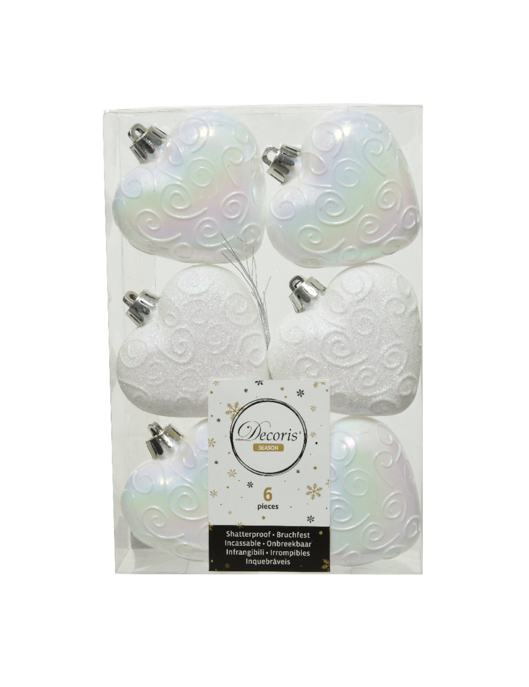 Sublimez votre décoration festive avec ce lot de 6 suspensions pour sapin d'environ 6 cm. En forme de cœurs d'un blanc éclatant, ces éléments décoratifs sont ornés de paillettes aux reflets iridescents. Ces élégants cœurs apporteront une note de féerie à votre intérieur pour les fêtes de Noël.
