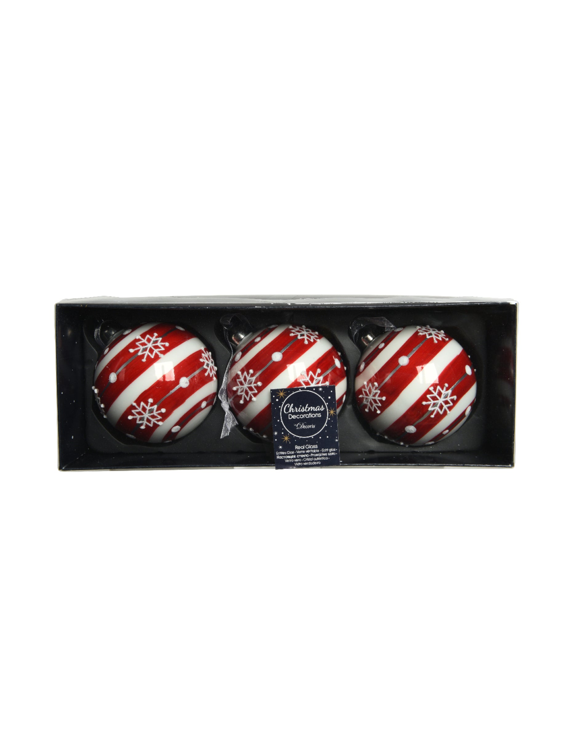 8 átmérőjű cm, Kétszínű piros-fehér csíkokkal és finom hópehely mintákkal díszítették őket. Válaszd ezeket! hagyományos bálok hogy fokozza a dekorációt a karácsonyi ünnepségek.
