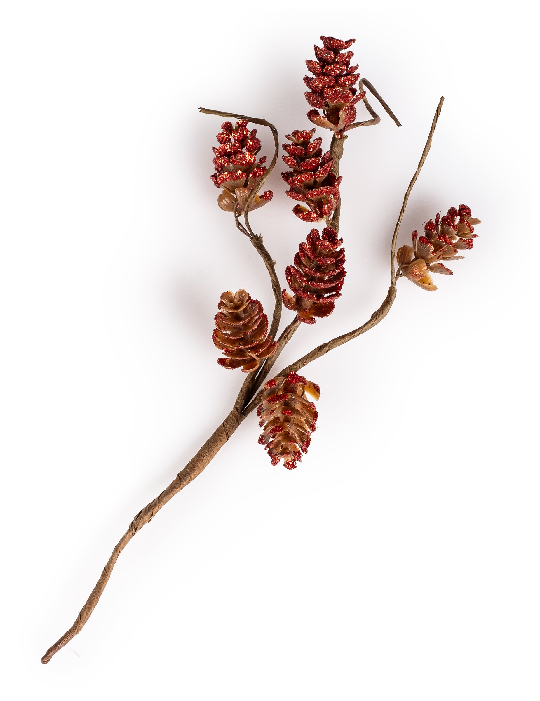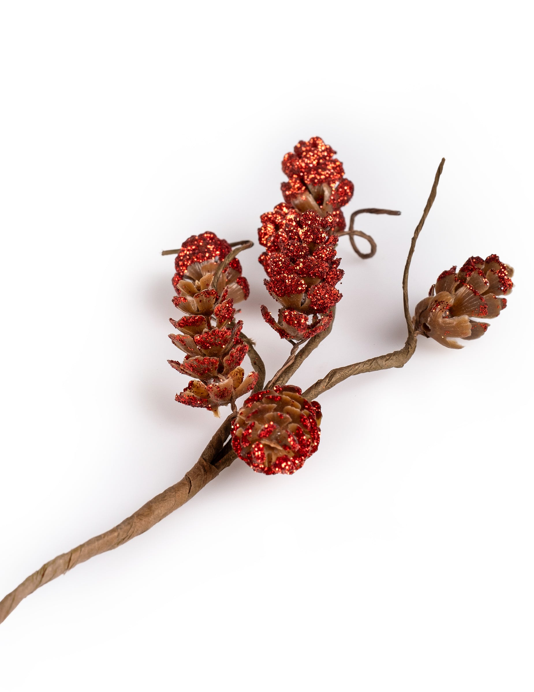 Apportez une touche d'éclat à vos festivités avec cette branche ornée de pommes de pin et de paillettes rouges scintillantes.