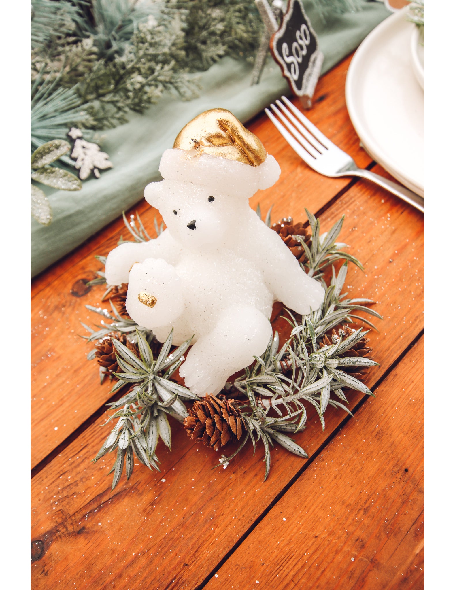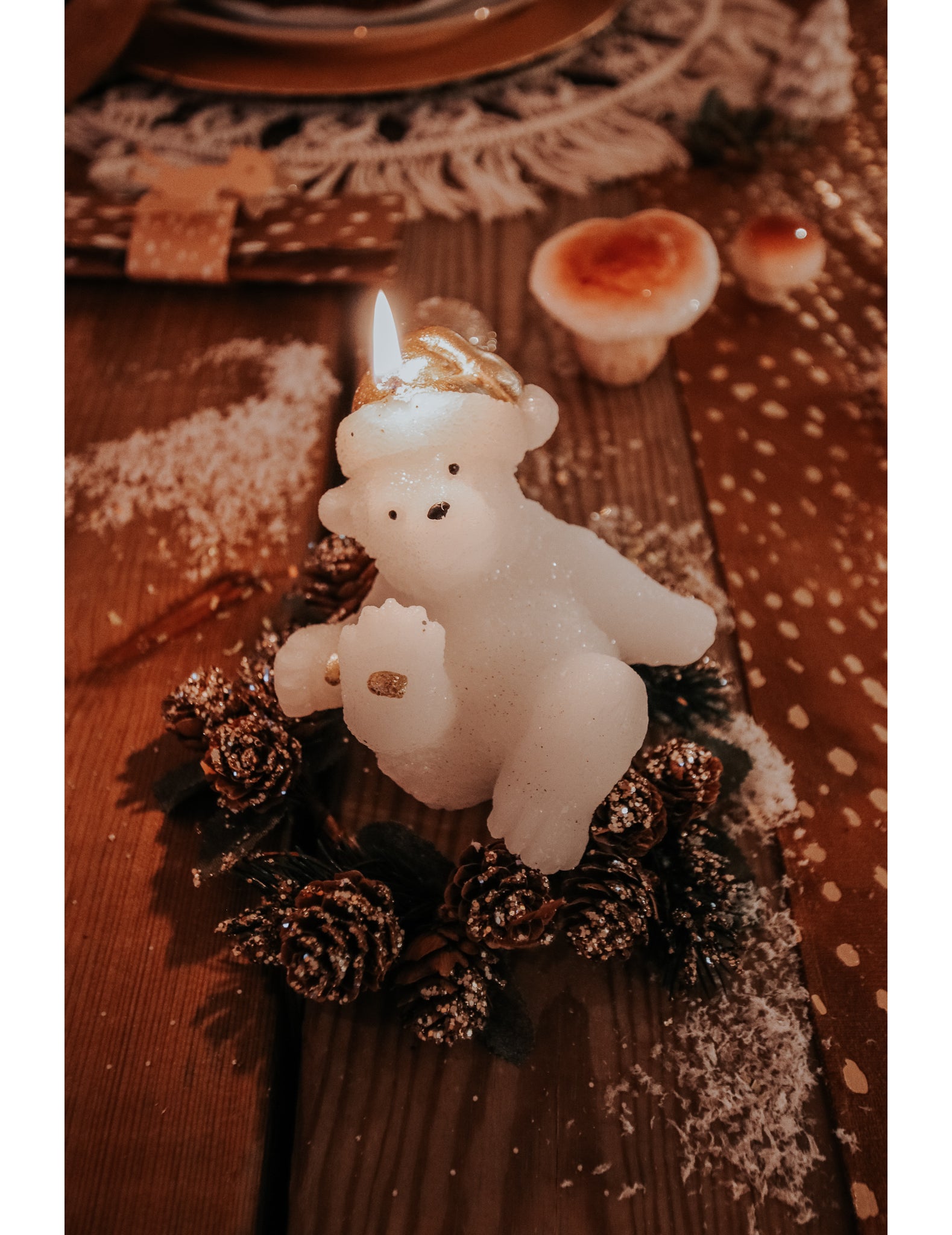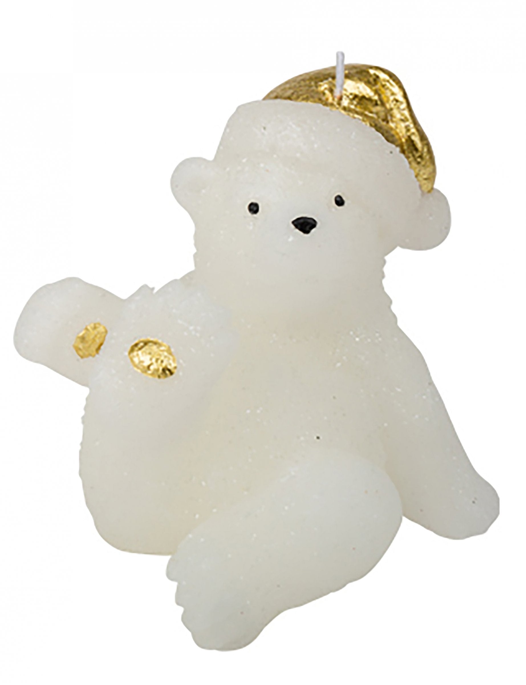 10 x 9,5 méretű cm, ez gyertya egy aranyos kis alakot ölt maci Fehér, arany kupakkal díszített. Ideális a téli esték feldobására. mackó gyertya puha és barátságos hangulatot teremt az asztalon karácsonyi poláris.