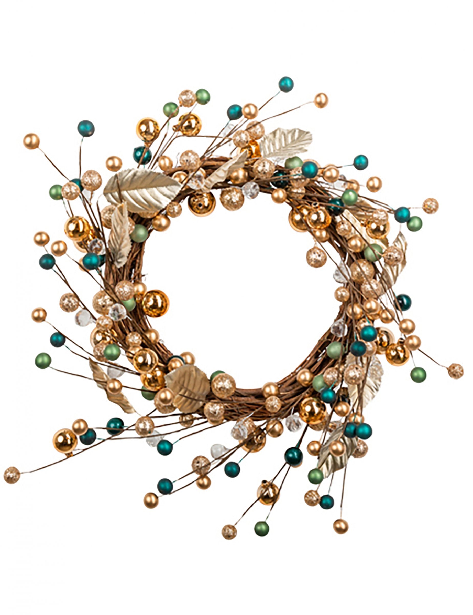 40 átmérőjű cm, ez dekoratív koszorú eleganciát kölcsönöz otthonának. Dizájnja harmonikusan ötvözi az ágakat, leveleket arany kiemelésekkel, valamint a zöld és türkiz árnyalatú csillogó gyöngyöket. Ez egy... korona kifinomult, ideális a hangulat megteremtéséhez karácsonyi egyedi és ünnepi.