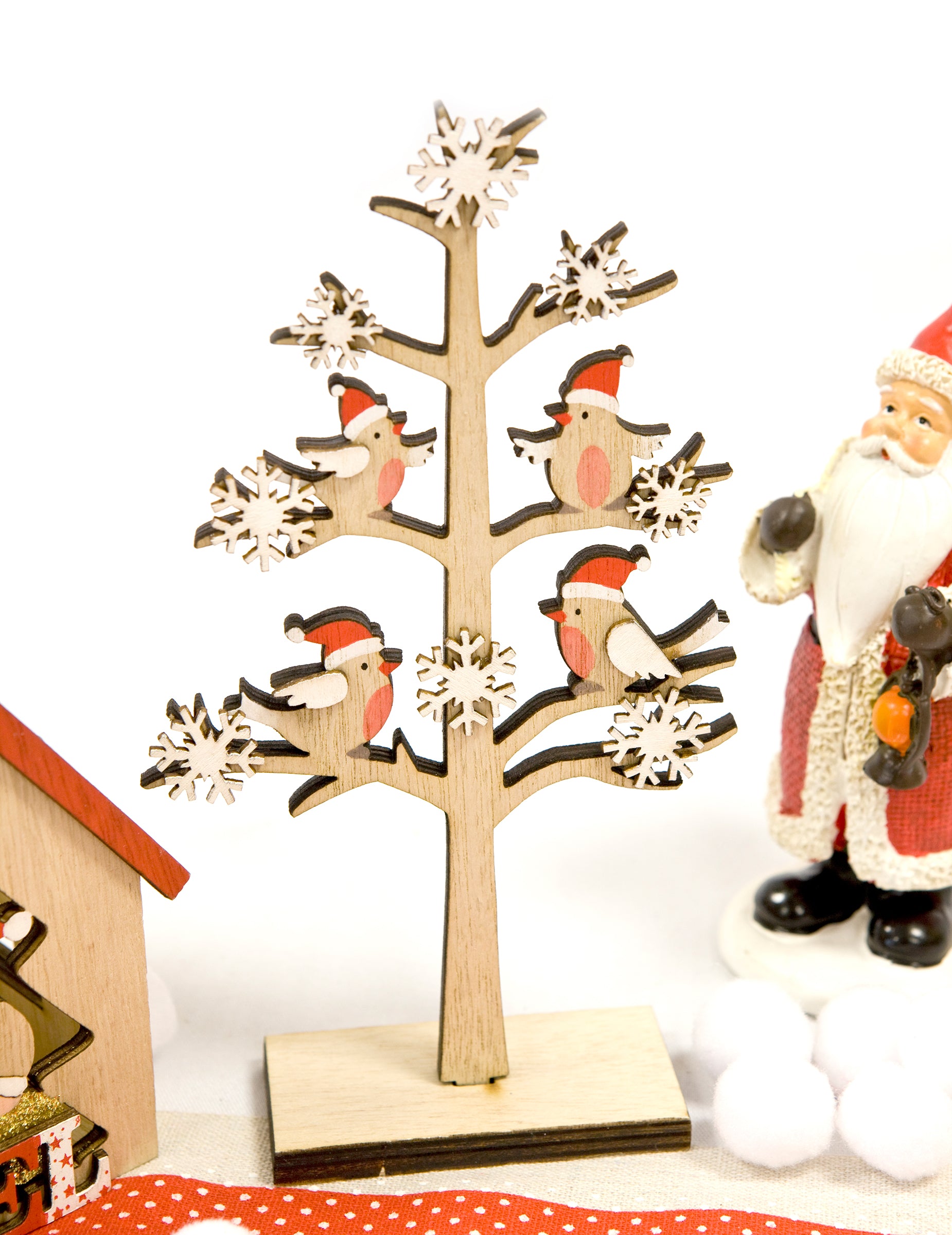 Vigyél természetes hatást otthonodba ezzel a kiegészítővel fa asztaldísz 18 x 11 x 4 cm. Imádnivaló madarakat ábrázol, akik egy Mikulás sapkaközepén ült hópelyhek gondosan vágva. Ennek köszönhetően asztaldísz, az étkezésed karácsonyi hitelességre és bájra tesz szert.