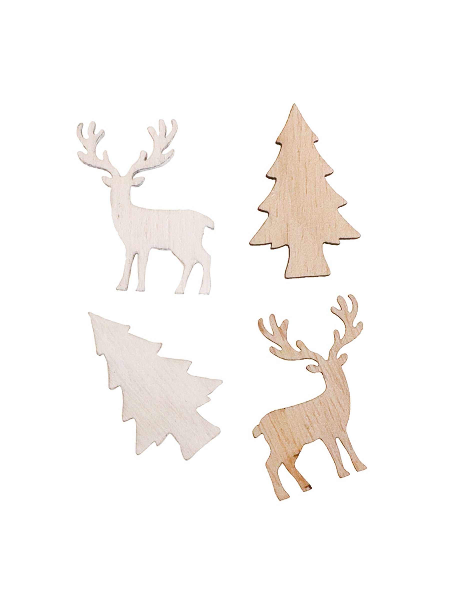 Ez a készlet 24 db -t tartalmaz. Fa konfetti. Körülbelül 3,5 cm -t mér, és a FIR -fák és a szarvas formája fehér és természetes hangon van. Szórja meg ezeket a konfettieket az asztalára, és díszítse növényekkel egy gyönyörű karácsonyi asztalhoz!
