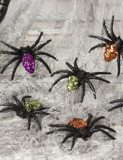 Ez a tétel 6 műanyag csillogó pókot tartalmaz, amelynek mérése 7,5 x 5,5 x 1,3 cm. A műanyag anyagból vörös, kék és zöld. Őket is csillogóan díszítik! Kiválóan alkalmas belső terek díszítésére Halloween estére vagy álcázott estére!