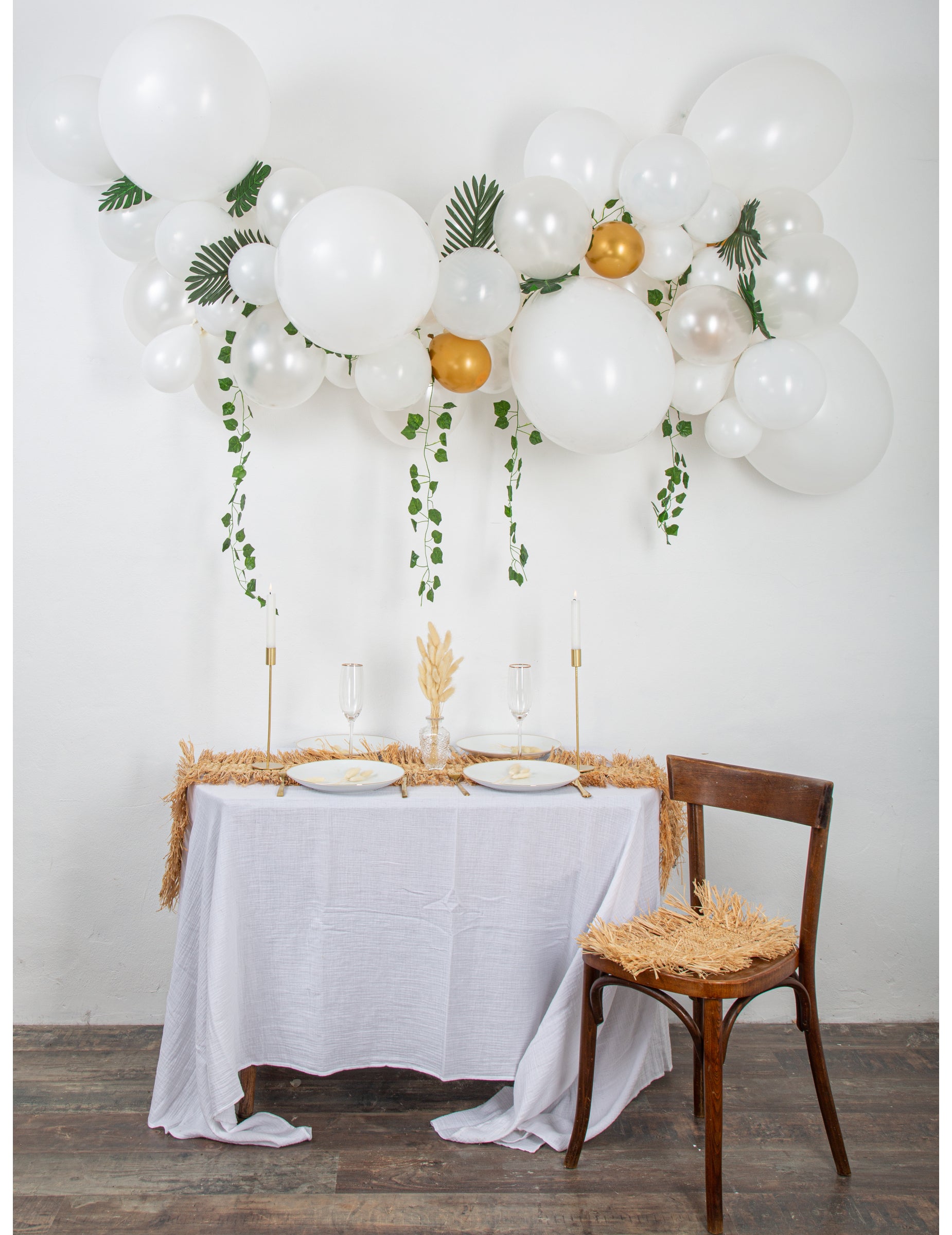 Emeld magasabb szintre az eseményed ezzel a komplett, 55 darabos készlettel, és alkoss egy... elegáns trópusi léggömbívEz a készlet lehetővé teszi, hogy légies és elegáns dekorációt alkosson, fehér és arany tónusokat ötvözve egy csipetnyi zölddel.