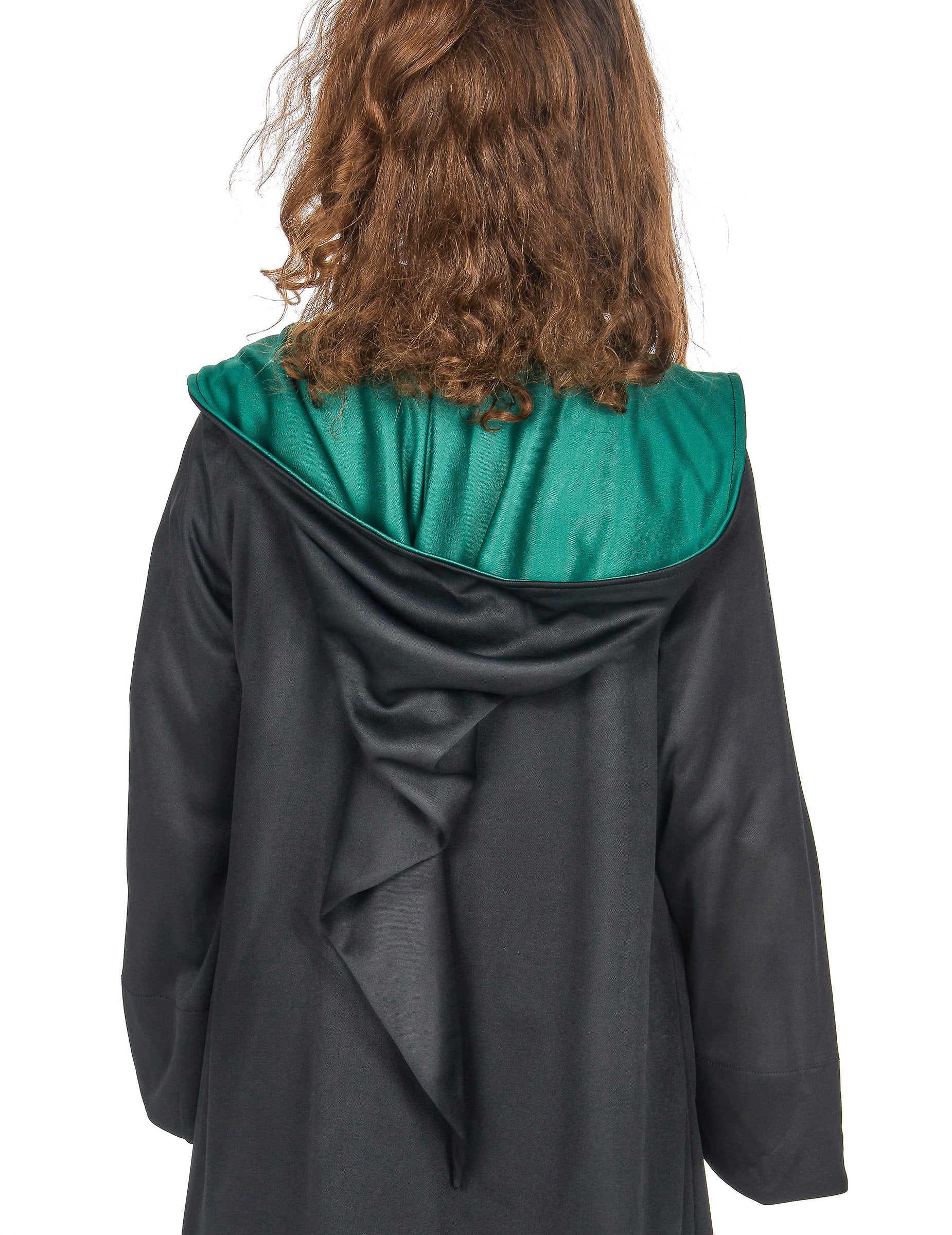 A jersey anyagból készült hosszú köpeny színes fekete És zöldHosszú, bő ujjakkal és hátul kapucnival rendelkezik. A ház címere látható. Mardekár a mellkasán van nyomtatva.