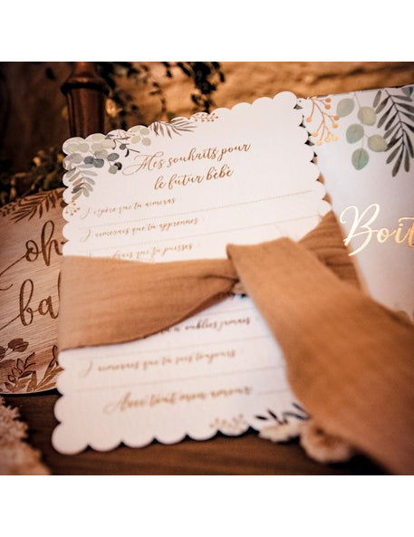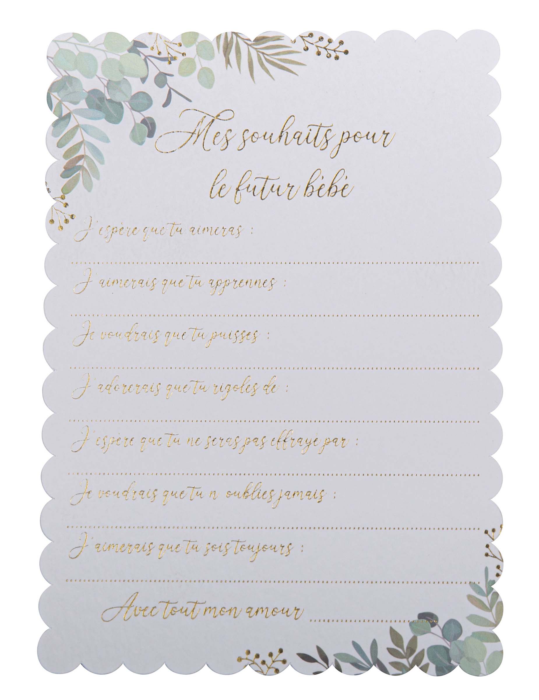 Ez a készlet 10 darabot tartalmaz üdvözlőlapok körülbelül 12,5 x 17,5 méretű cm. Fehér színűek, kagylós szélűek, finom növényi motívumokkal díszítettek, és... kívánságok a leendő babához Ezek a kártyák személyre szabhatók. A vendégek szórakozva fejezhetnek ki inspiráló mondatokat, például: „Bárcsak tudnál…” vagy „Bárcsak mindig az lennél…”. Ezek az elegáns kártyák lehetővé teszik szeretteid számára, hogy maradandó emléket hagyjanak egy különleges eseményen. babaváró buli ünnepies.