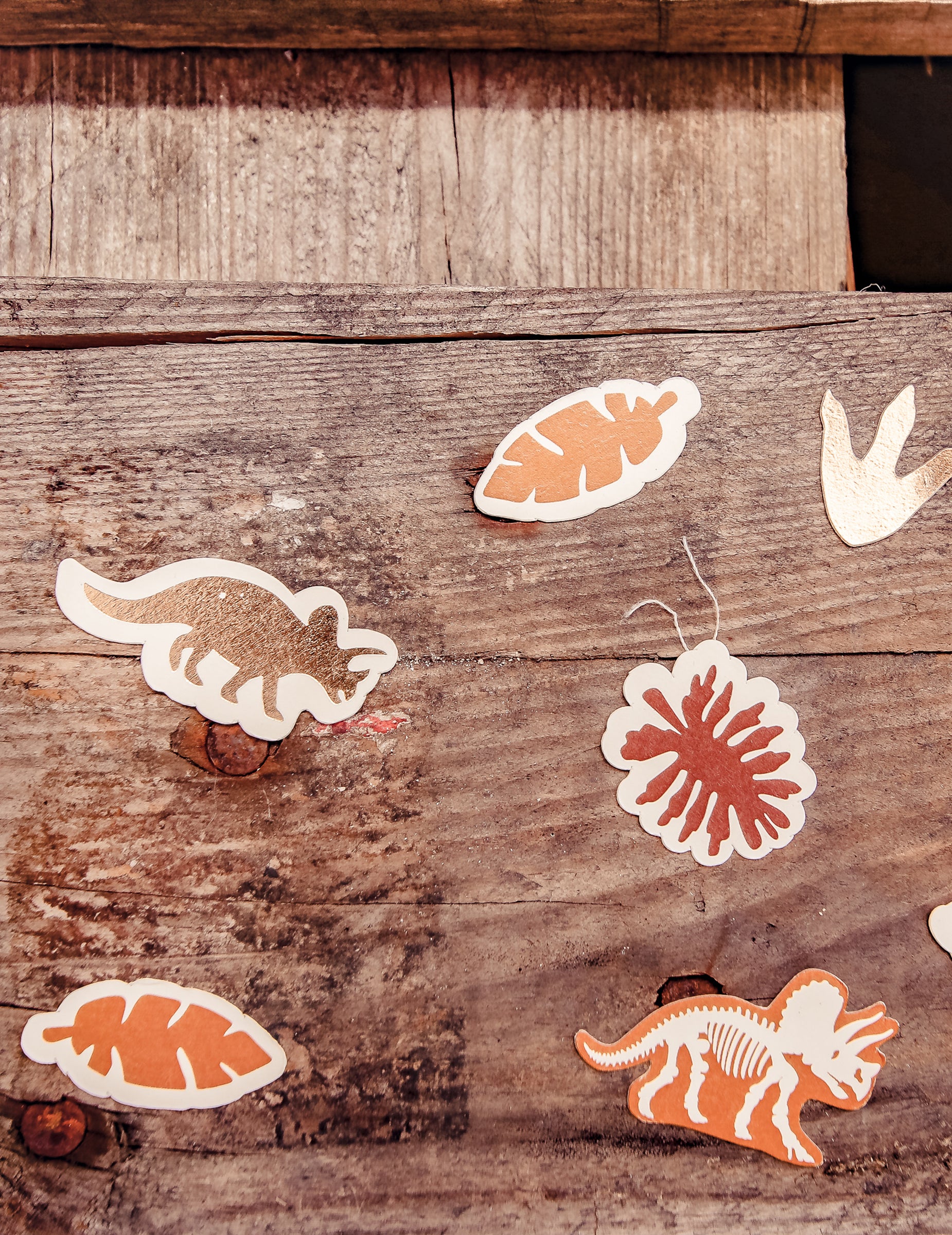 Ces éléments de décoration illustrent des feuillages tropicaux, des silhouettes de dinosaures ainsi que l'inscription joyeux anniversaire. Déclinés dans des nuances élégantes de chocolat, camel et doré, ils sont parfaits pour agrémenter votre décoration de table lors d'un anniversaire dinosaure mémorable.