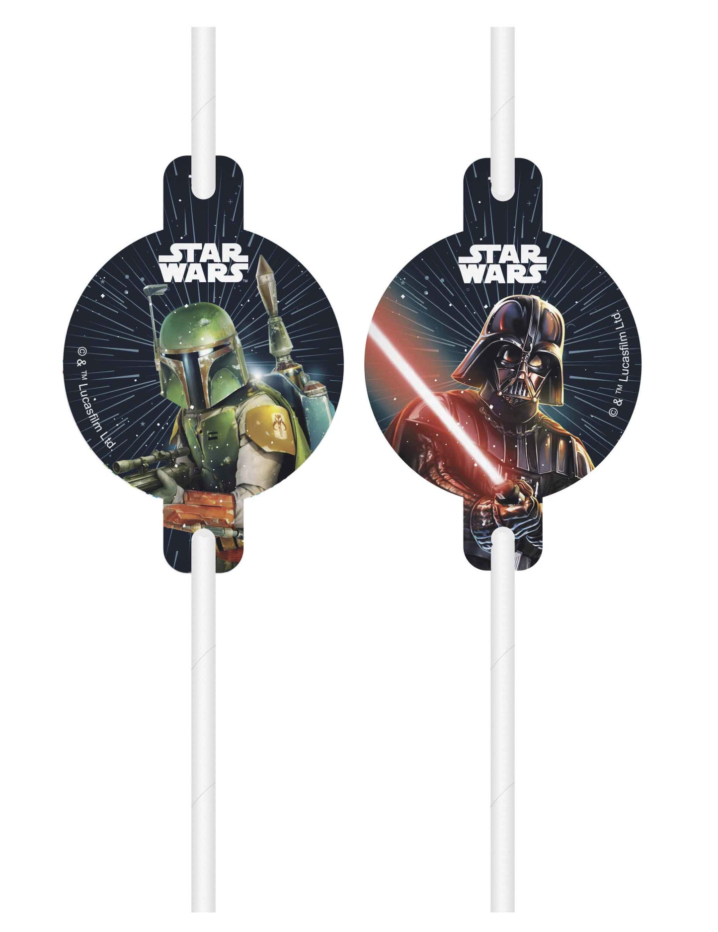 Ez a tétel a 4 Csillagok háborús medál szalmából áll, hivatalos engedély alapján. Műanyagban olyan kartonmarratokkal díszítik őket, amelyekre a Csillagok háborúja karaktereket nyomtatják, mint például a Boba Fett vagy a Dark Vader. Ezek a szalmák ideálisak lesznek az asztali dekoráció befejezéséhez egy születésnapi partiján!