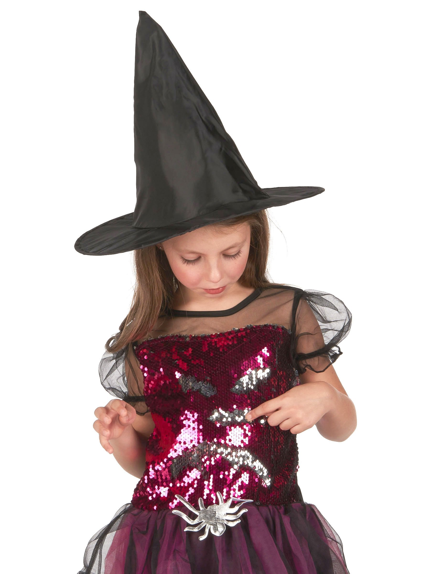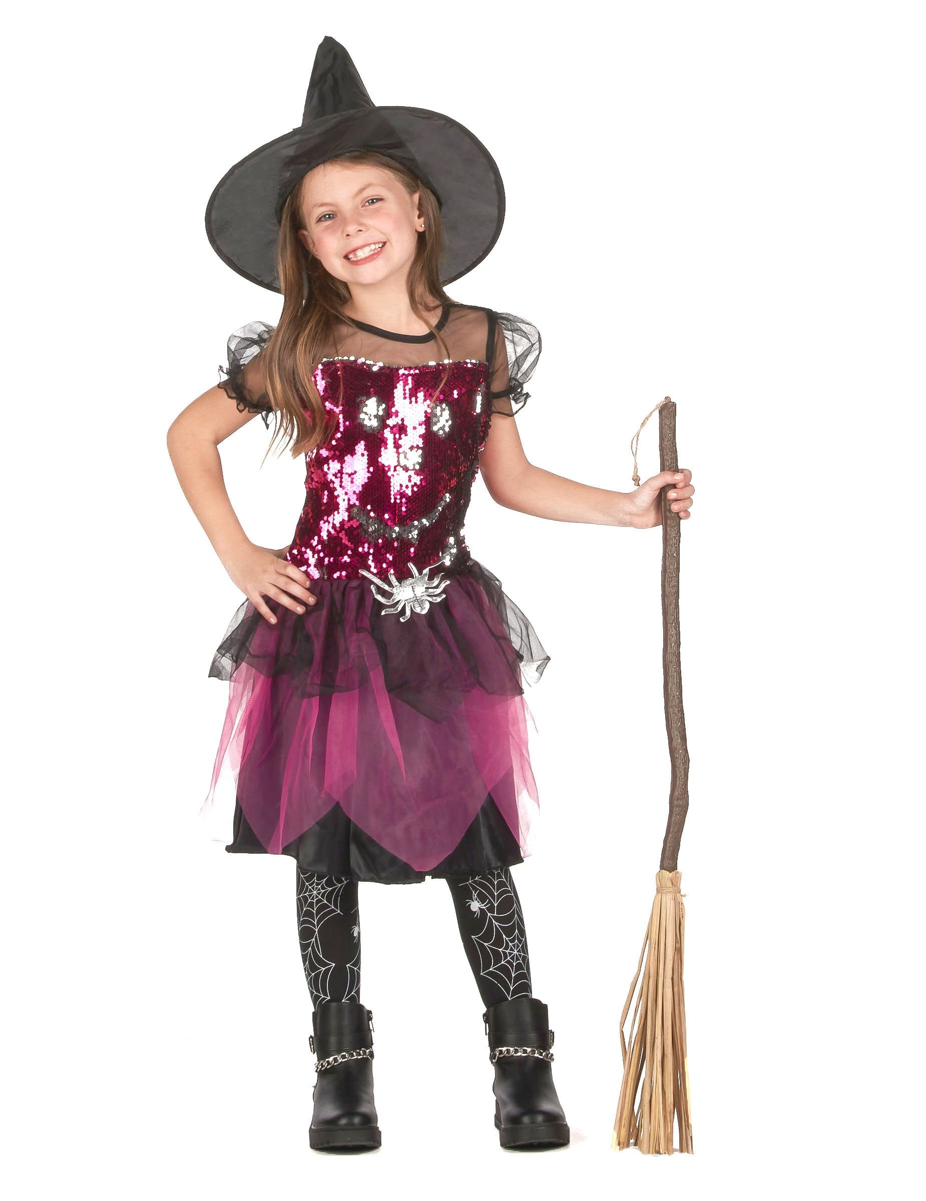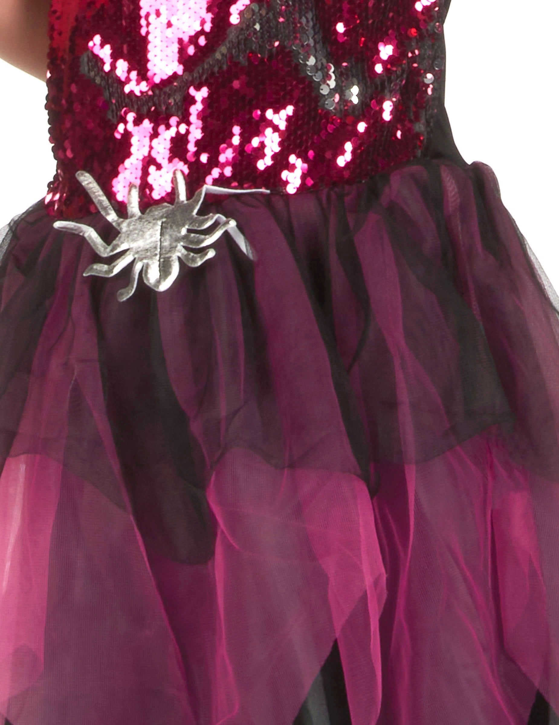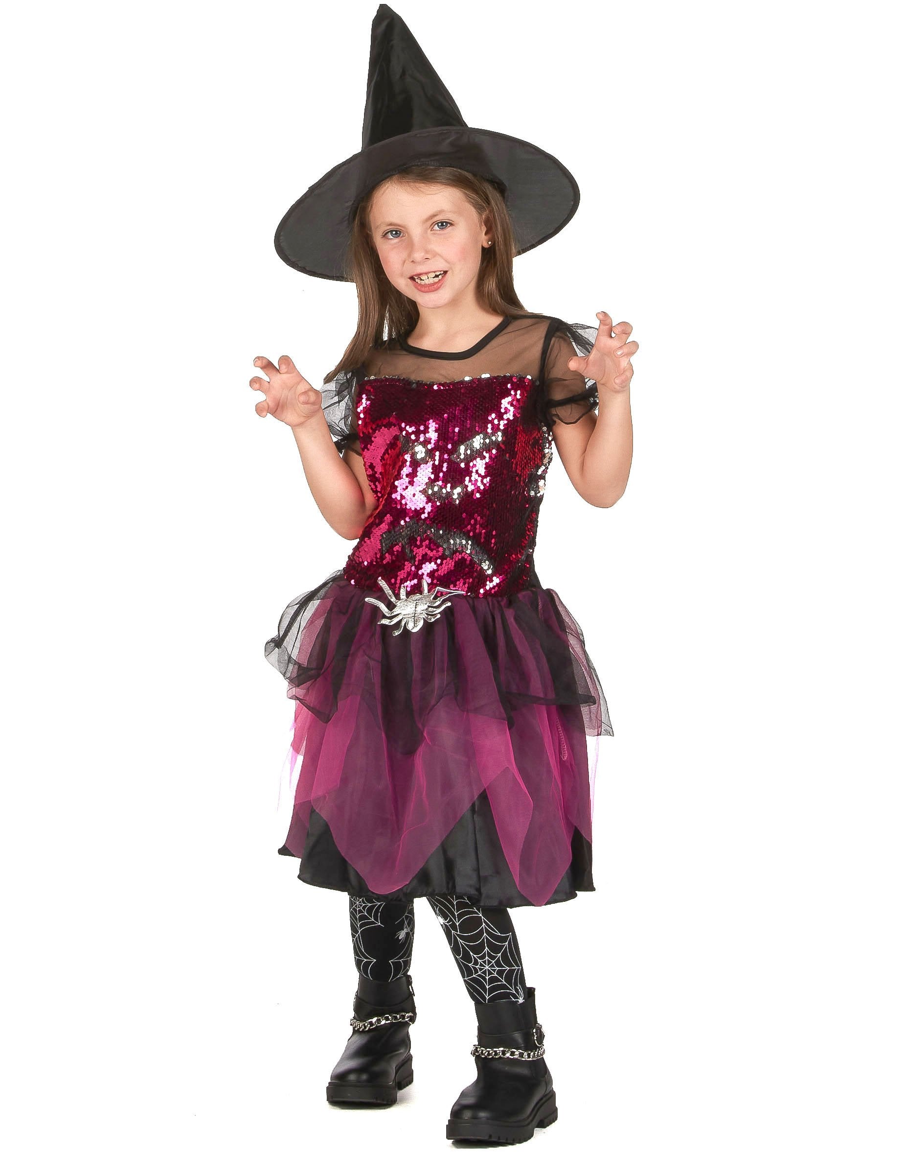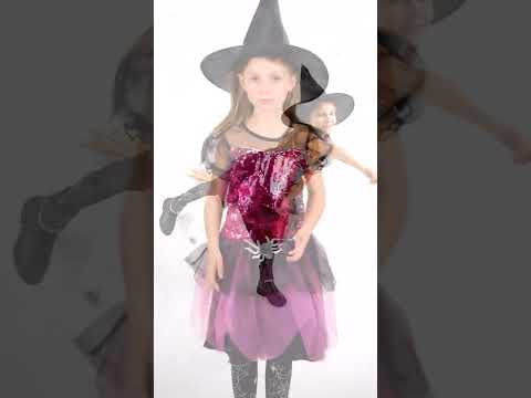 Ez a boszorkány jelmez lánynak szól, és ruhából és kalapból áll. A ruha rózsaszínű és fekete színű. A tetejét elöl reverzibilis és ezüst reverzibilis flitterrel borítják. A rövid ujjú puffadt és átlátszó col. A rózsa alja fekete, elöl rózsaszínű és fekete tüll. Egy csodálatos ezüst pók díszíti a ruha méretét. A hegyes és a fekete kalap az utolsó érintést hozza ennek az álrizónak. A lányod tökéletes lesz ebben a boszorkány álrizójában a Halloween Candy Hunt -jához!
