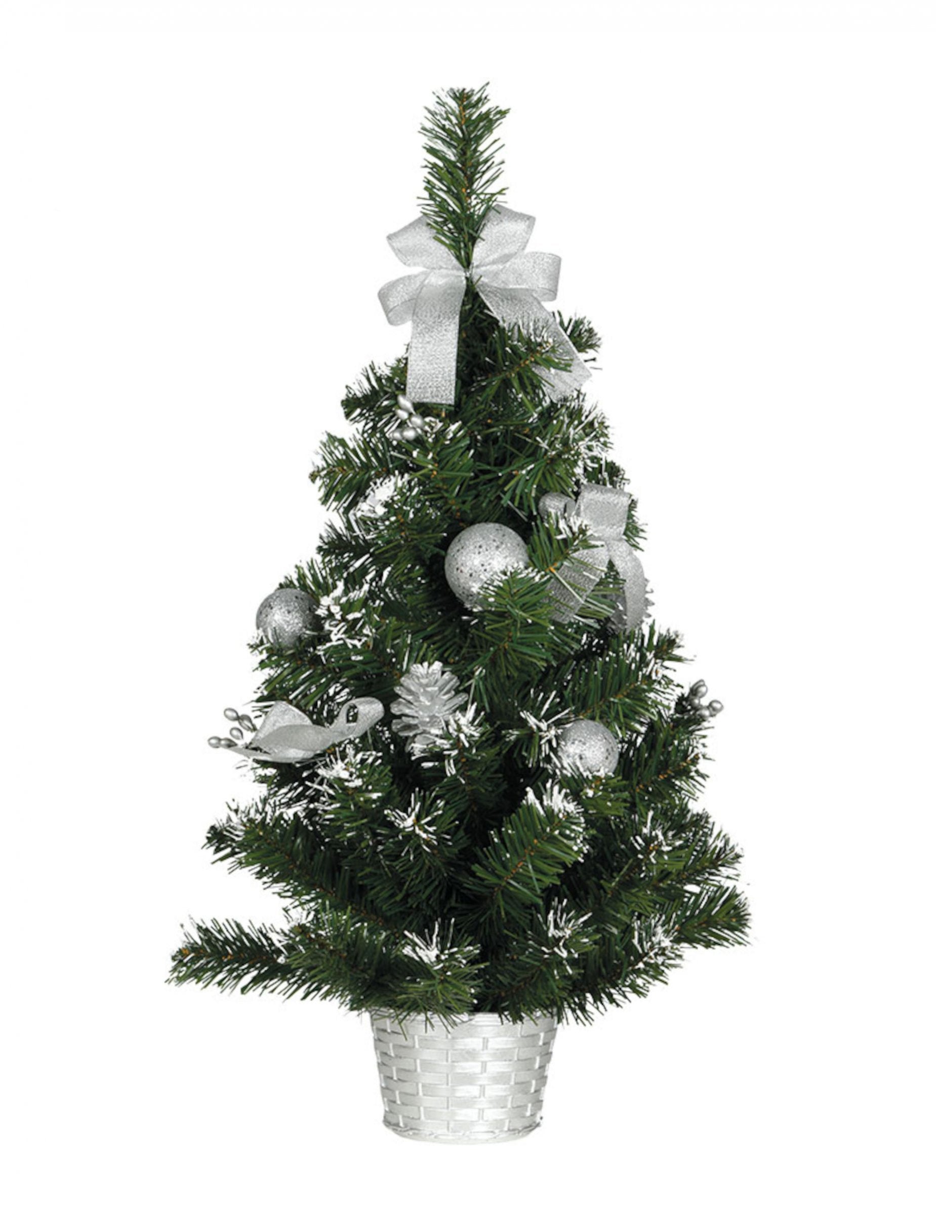 Karácsonyfa ezüst díszekkel díszített állványon 60 cm havas megjelenés