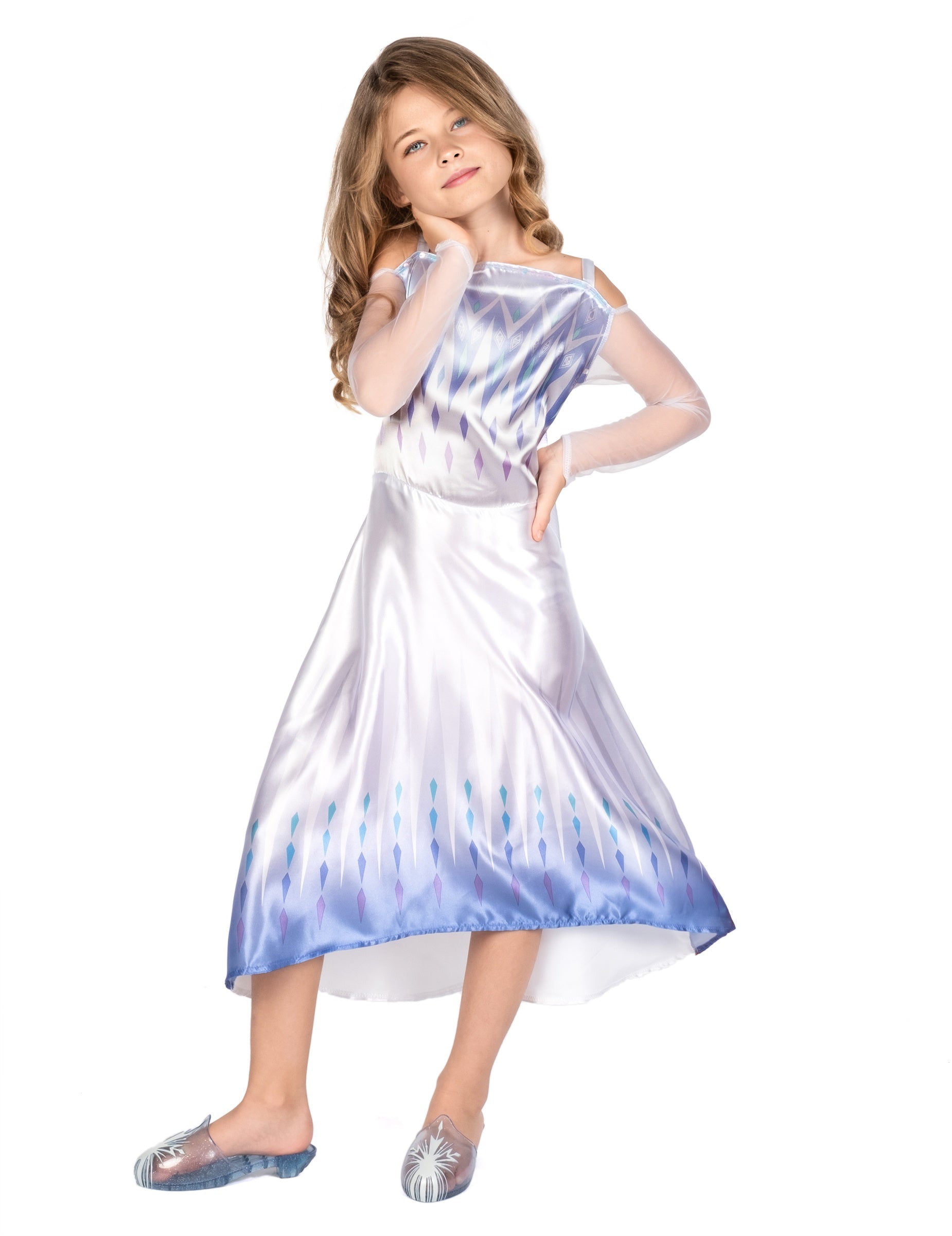A Neiges 2 jelmezének Elsa királynője hivatalos Disney engedély alá tartozik. A lány számára ez egy ruhából áll. A ruha a híres Arendelle királynő jelmeze. Fehér színű, kék árnyalatokkal, és a felső és az alján gyémántnyomással rendelkezik. Az ujjak hosszúak és a kék színű tüll végén vannak. A lányod kalandra fog menni Anna, Kristoff és Olaf mellett ezzel az Elsa Queen Snow 2 jelmez a Carnival számára!