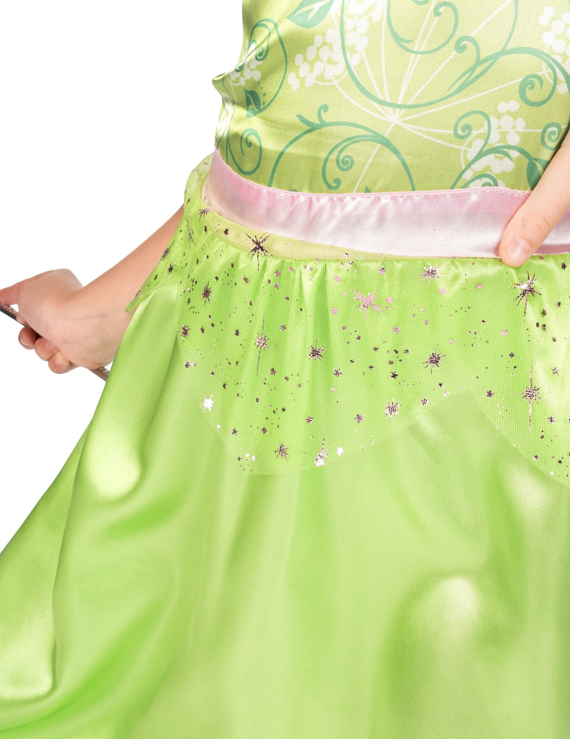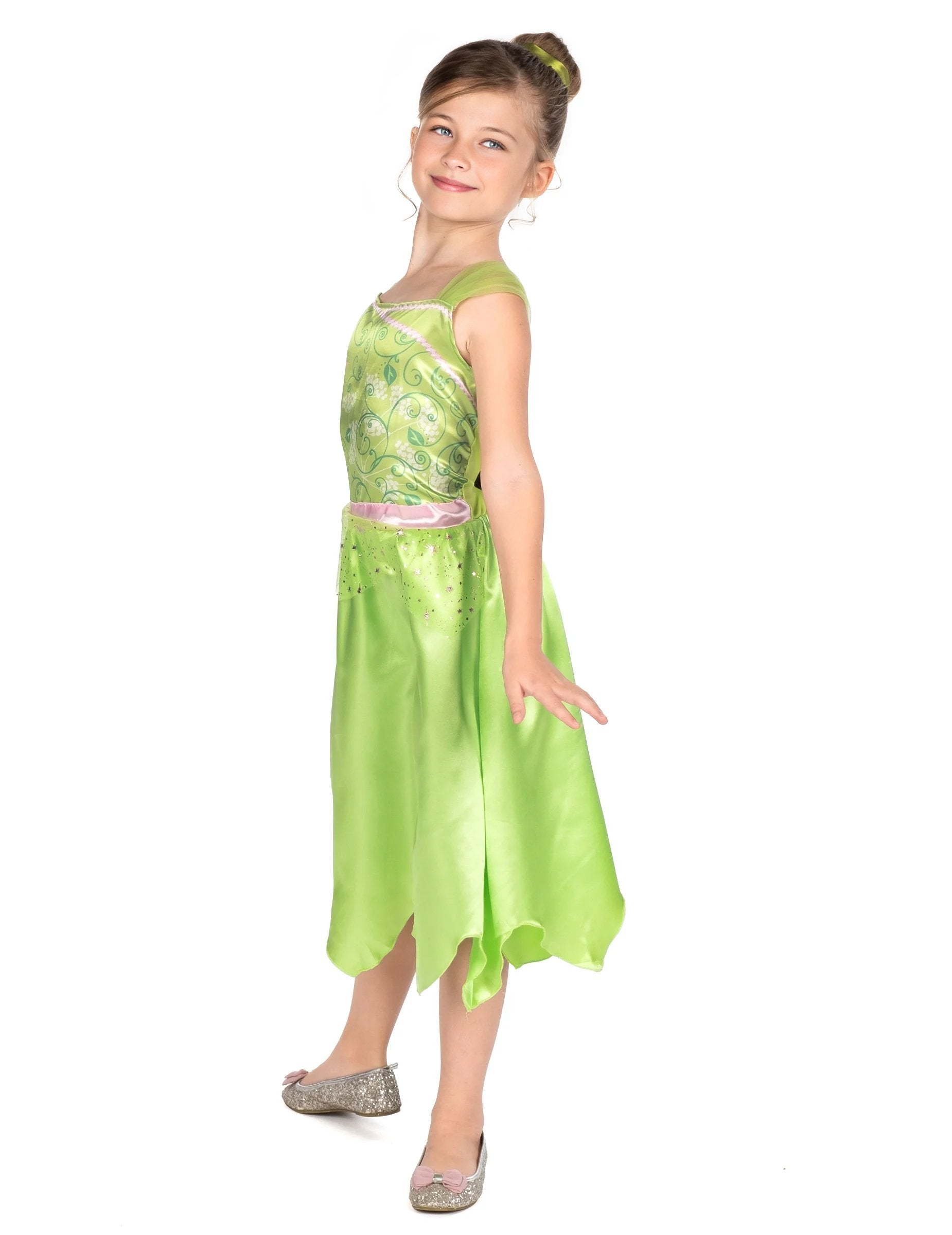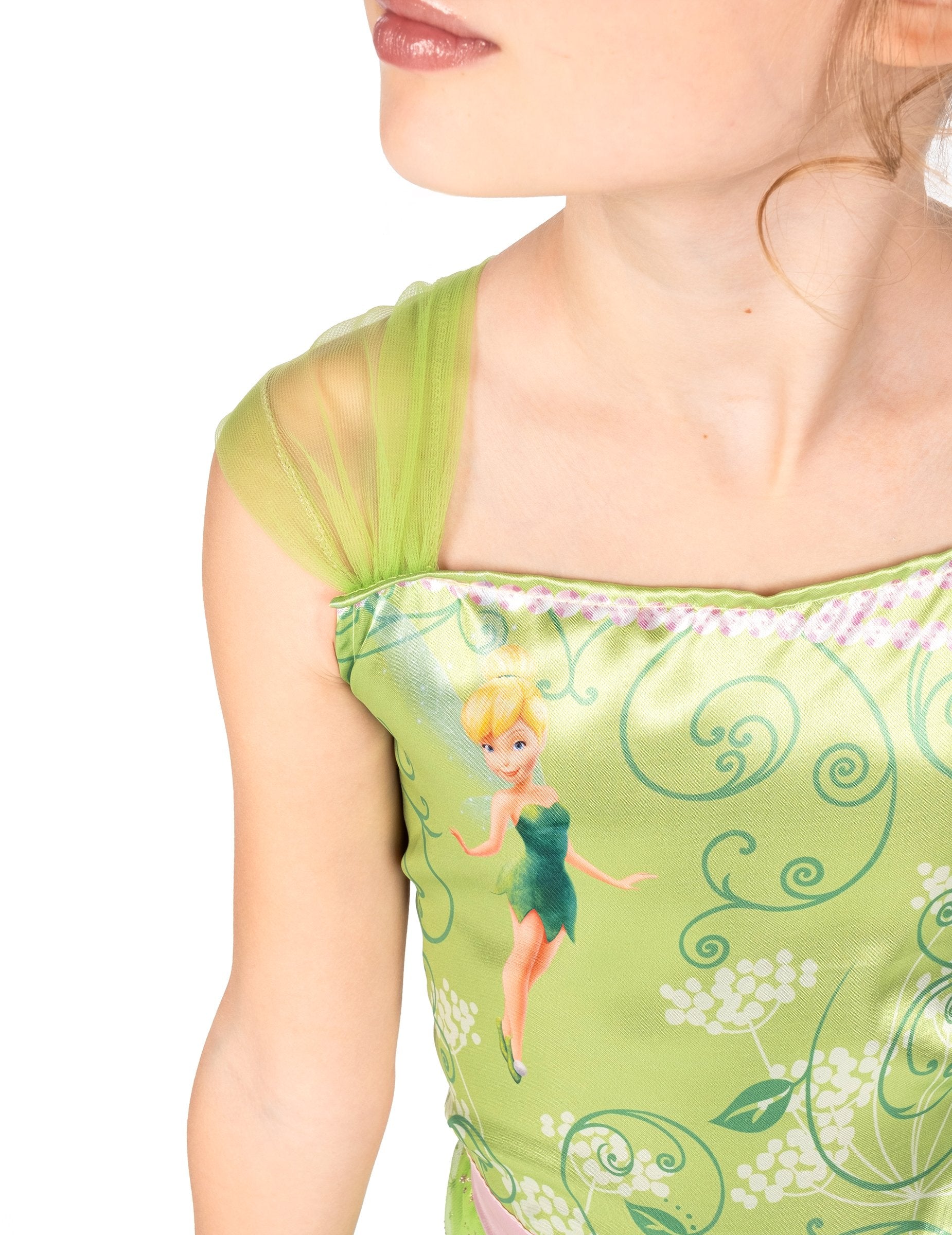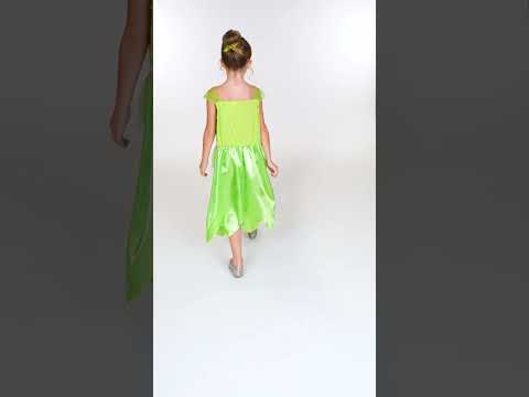 A pánt nélküli ruha zöld szatén anyagból készült a fokozott csillogás érdekében. Egy csinos Csingiling minta díszíti a felsőrészt. Egy rózsaszín szatén szalag húzza össze a ruhát a derekánál. A rózsaszín tüll szalagok csinos flitterekkel még több bájt kölcsönöznek ennek a bájos ruhának. rajzfilm tündérruha.