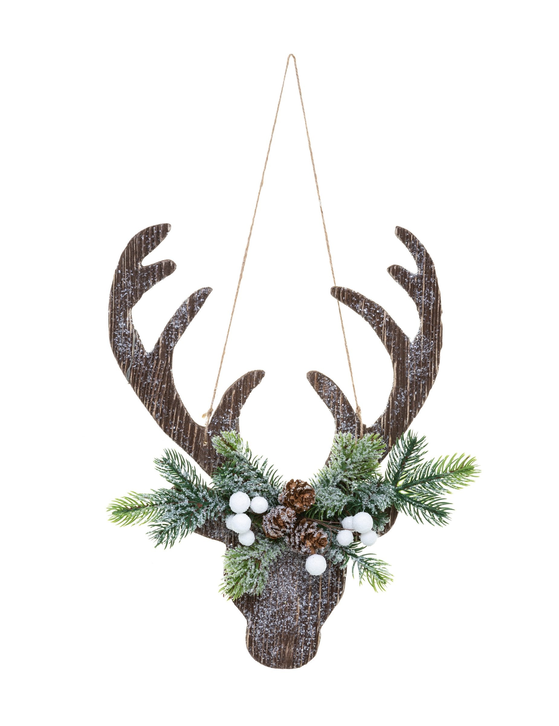 Ez a dísz egy fejet ábrázol rénszarvas Egy barna jelenet lenyűgöző ágakkal díszítve. Botanikai elemek, mint például zöld levelek, fenyőtobozok és apró fehér gyöngyök teszik teljessé ezt az erdei jelenetet. Egy zsinórral könnyen felakasztható a falra vagy az ajtóra.