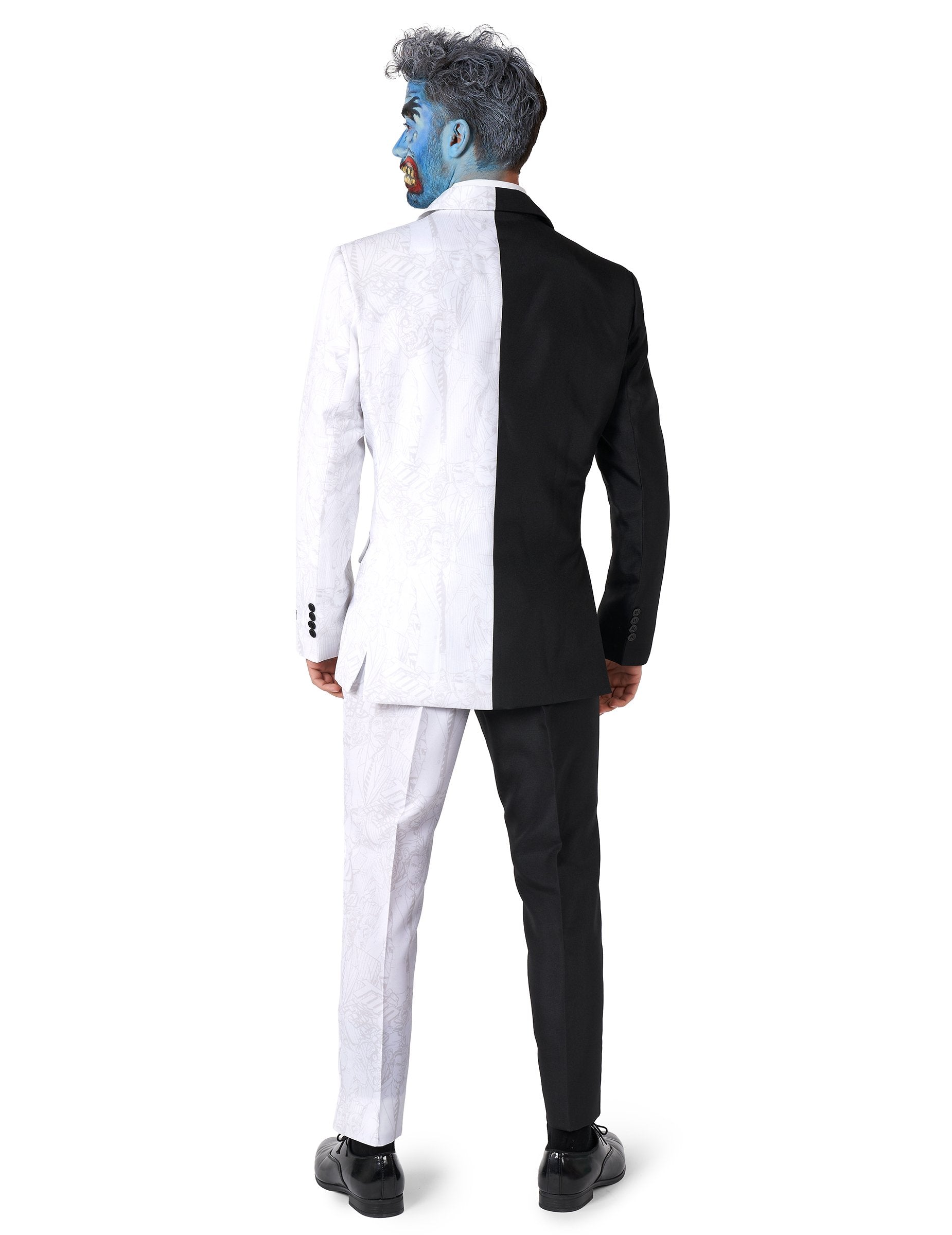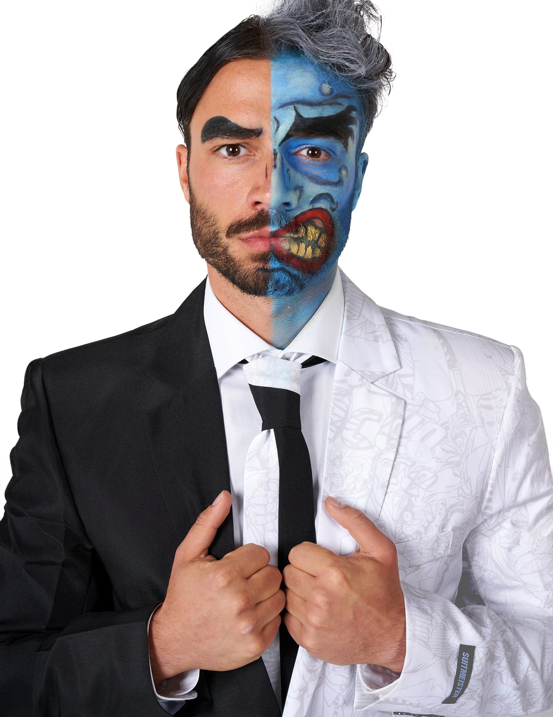 Ez a kettős oldalú felnőttek számára a hivatalos engedély alá tartozó engedélyt kell követni. Tartalmaz egy kabátot, nadrágot és nyakkendőt. A jelmezkabát eredeti jellemzője, hogy két különböző színben legyen: a jobb oldalon fekete és a bal oldalon fehér. A bal oldalon a bal oldalon is megtalálható a Joker fehér, pótkocsi -mintáin. A nadrág és a nyakkendő ugyanolyan tulajdonságokkal rendelkezik, mint a jelmezkabát. Ez a kettős oldalú jelmez ideális lesz a Halloween vagy a Carnival estének tökéletesítéséhez!