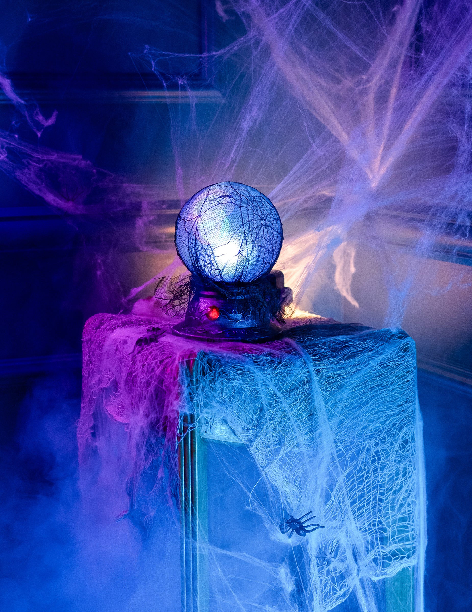 Ez a ragyogó és hangkristálygömb körülbelül 19 x 13 cm -t mér. Ennek az animált dekorációnak egy idős ezüstfém -bázissal rendelkezik, amelyet hamis piros gyémánt díszít. Ezt egy fekete -color átlátszó fátyol díszíti. Kék, majd fehér színű lesz, és félelmetes hangokat bocsát ki, amelyek libabumpákat adnak neked ...! Ez a kristálygömb ideális lesz a belső dekoráció tökéletesítéséhez a Halloween estén!