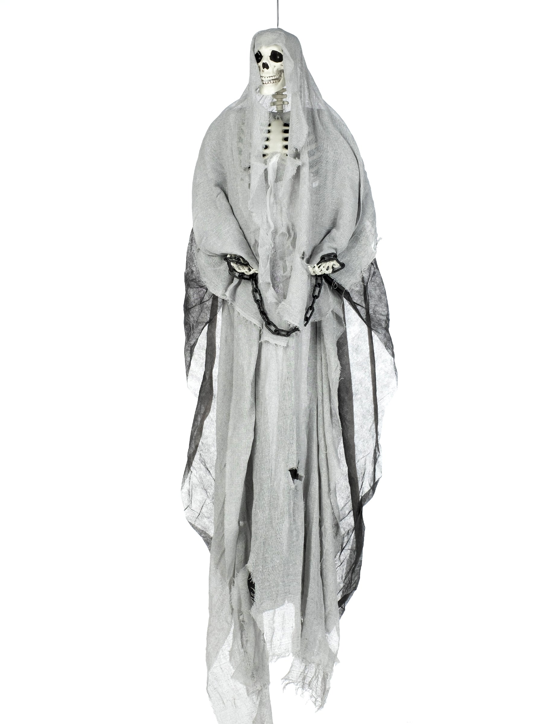 Ez a Halloween csontváz körülbelül 180 cm magas. Ez a dekoráció egy nagy csontváz, óriási dimenziókkal jelöli! Több színű szürke színű, sötét köpenyt. Nagy, fehér kézzel díszítve, egy pár bilincskel. Ez a szellemváz megkülönbözteti, hogy a vörös szeme sötétben villog! Könnyedén felfüggesztheti, köszönhetően ennek a célnak. Ez a gonosz dekoráció ideális lesz a szabadtéri vagy belső dekoráció tökéletesítéséhez a Halloween rendezvénye során a barátaival!
