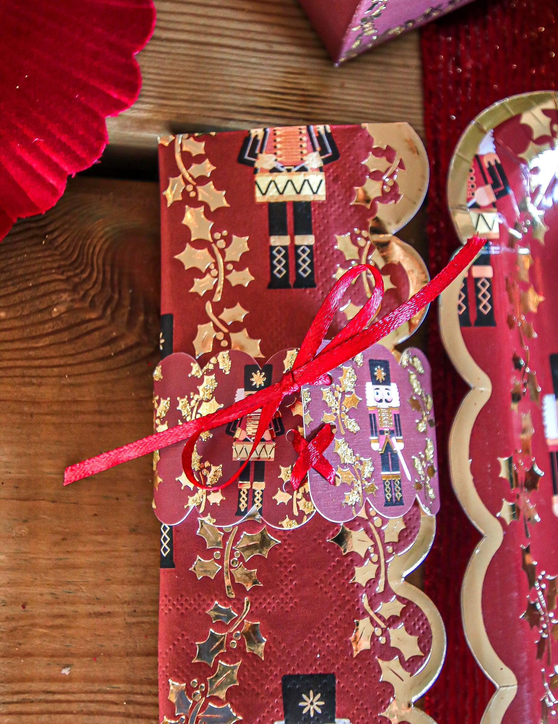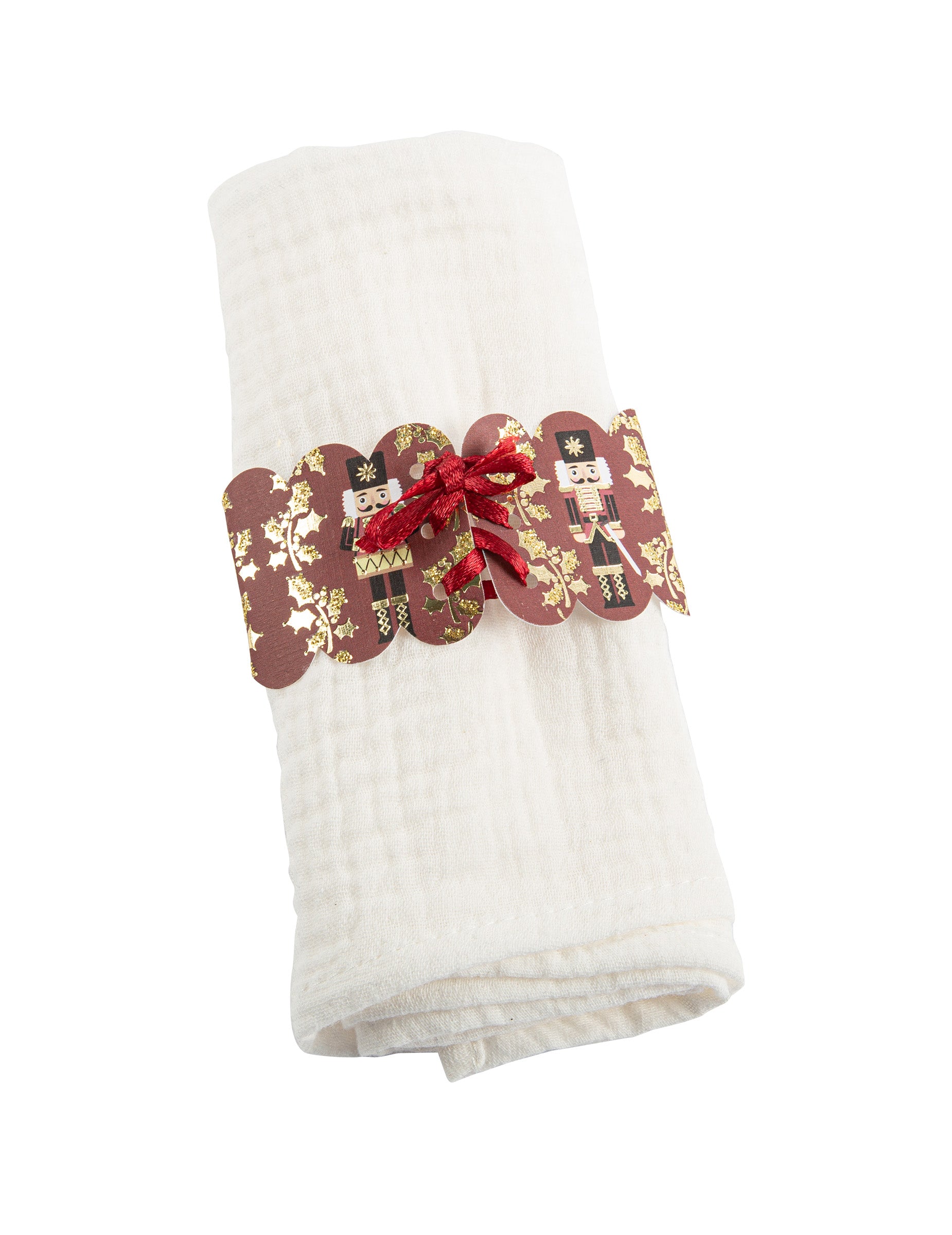 Tedd felejthetetlenné az ünneplésedet ezzel a szettel 8 diótörő szalvétagyűrűMinden darab mérete körülbelül 16 x 4 cm és illusztrálja a híres témát diótörő Két katonát ábrázol bordó háttér előtt, arany girland motívumokkal. Az egyszerű és elegáns felhelyezéshez egy piros szatén szalag is tartozik a könnyű rögzítéshez. Ez a készlet tökéletesen kiegészíti majd a... asztaldísz alatt Szenteste.